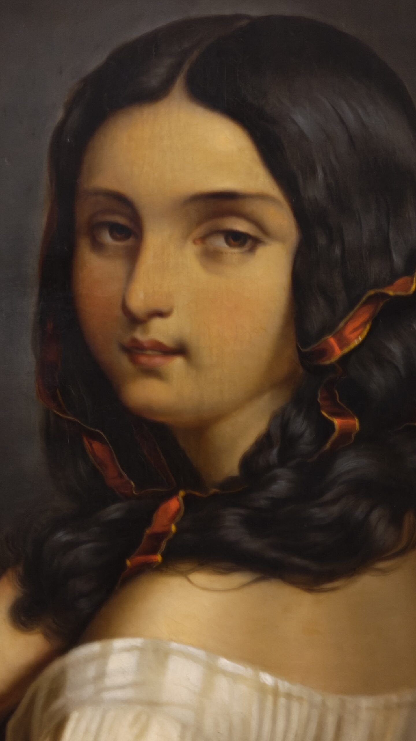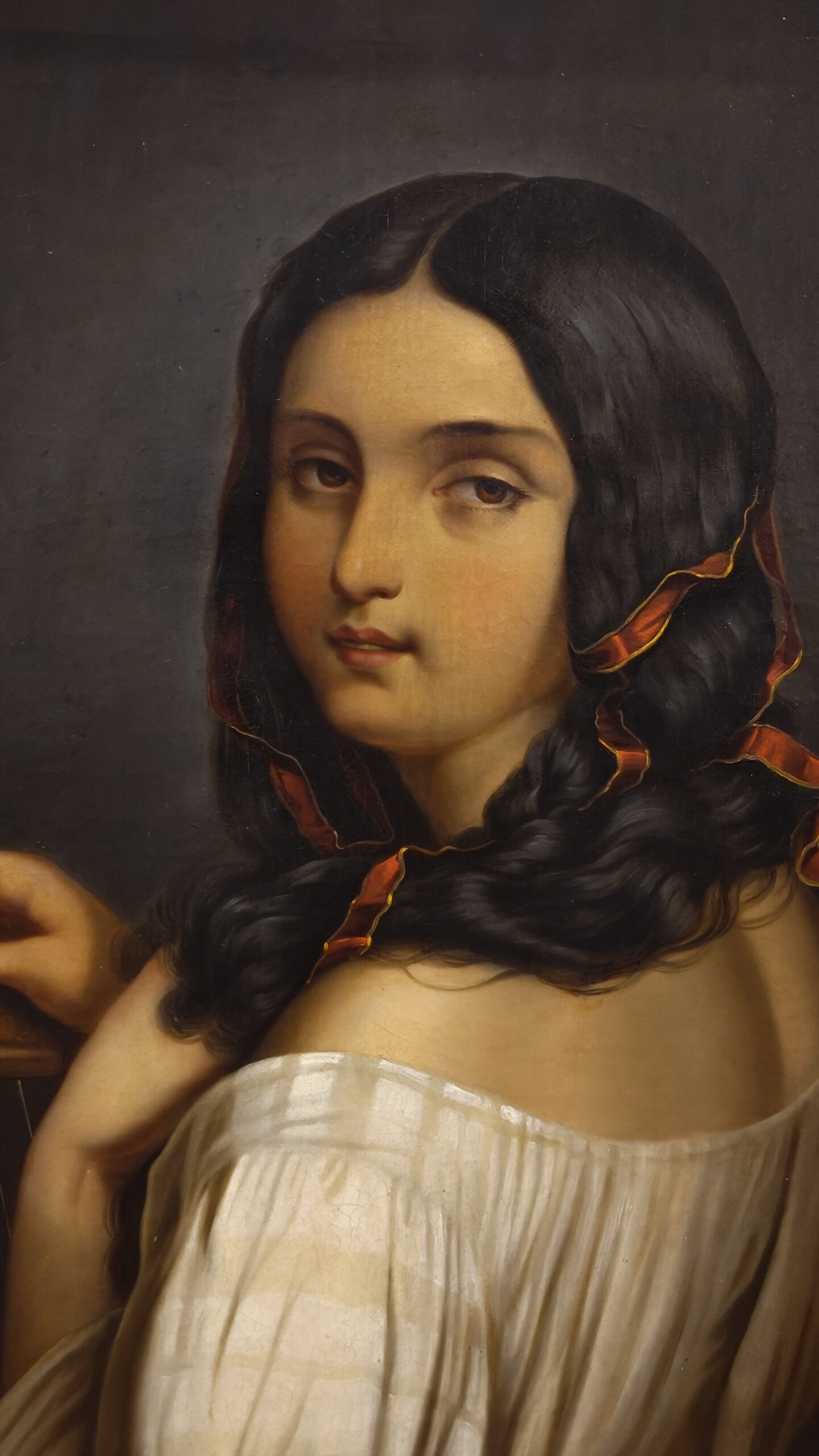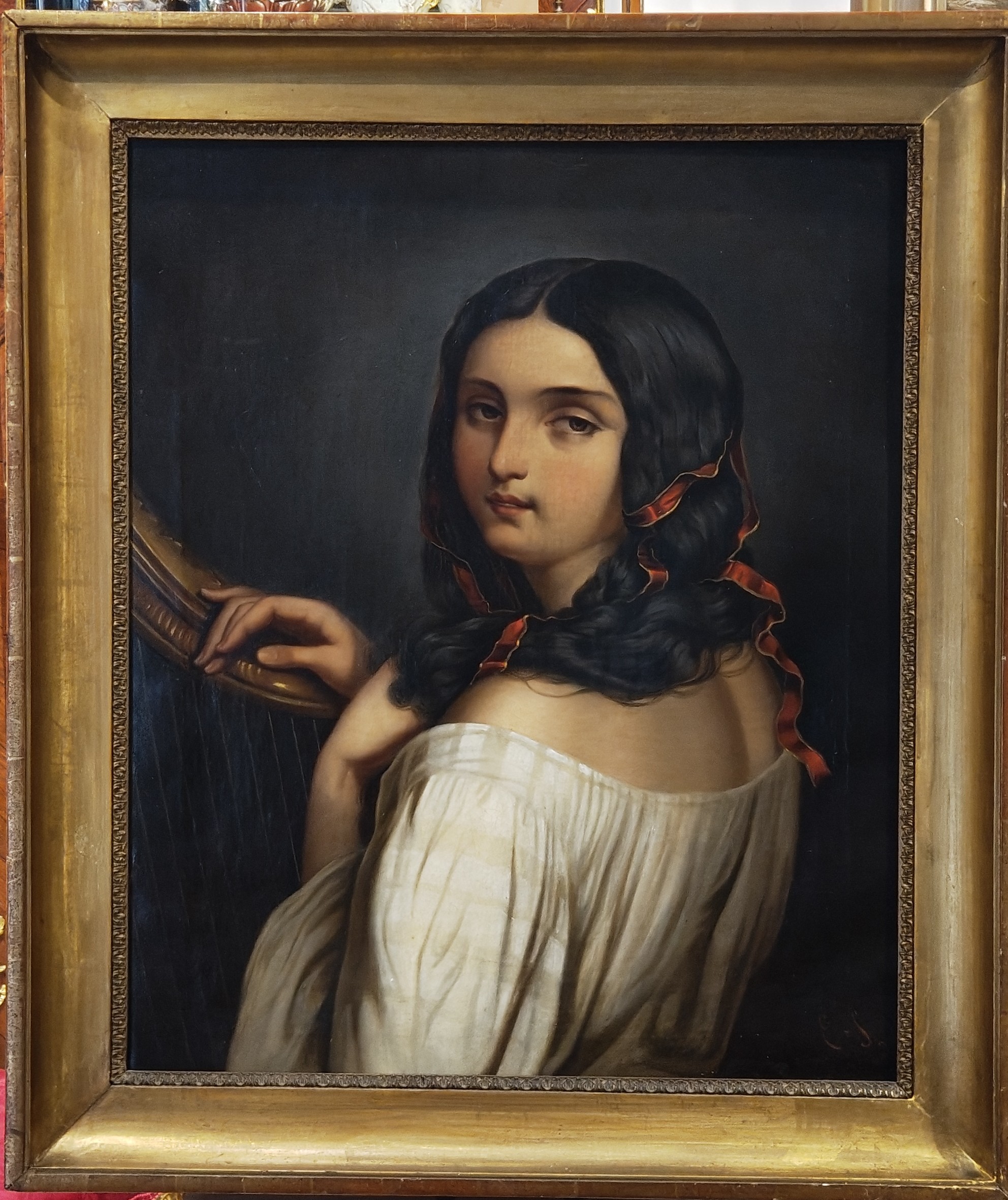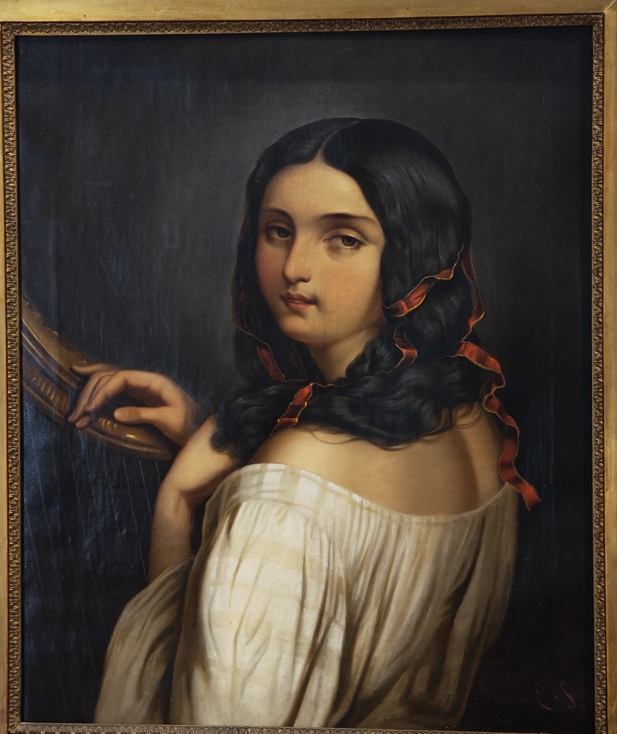 Widok z tyłu na młodą, ponętną kobietę z Europy Południowej z czerwoną wstążką w długich, czarnych włosach, trzymającą harfę w dłoni i spoglądającą przez ramię na widza. Ten delikatnie szkliwiony obraz, olej na płótnie, około 1880 roku, z monogramem „E.S.” w prawym dolnym rogu, z niewyraźnym napisem „Ernst Sch…” na odwrocie blejtramu.