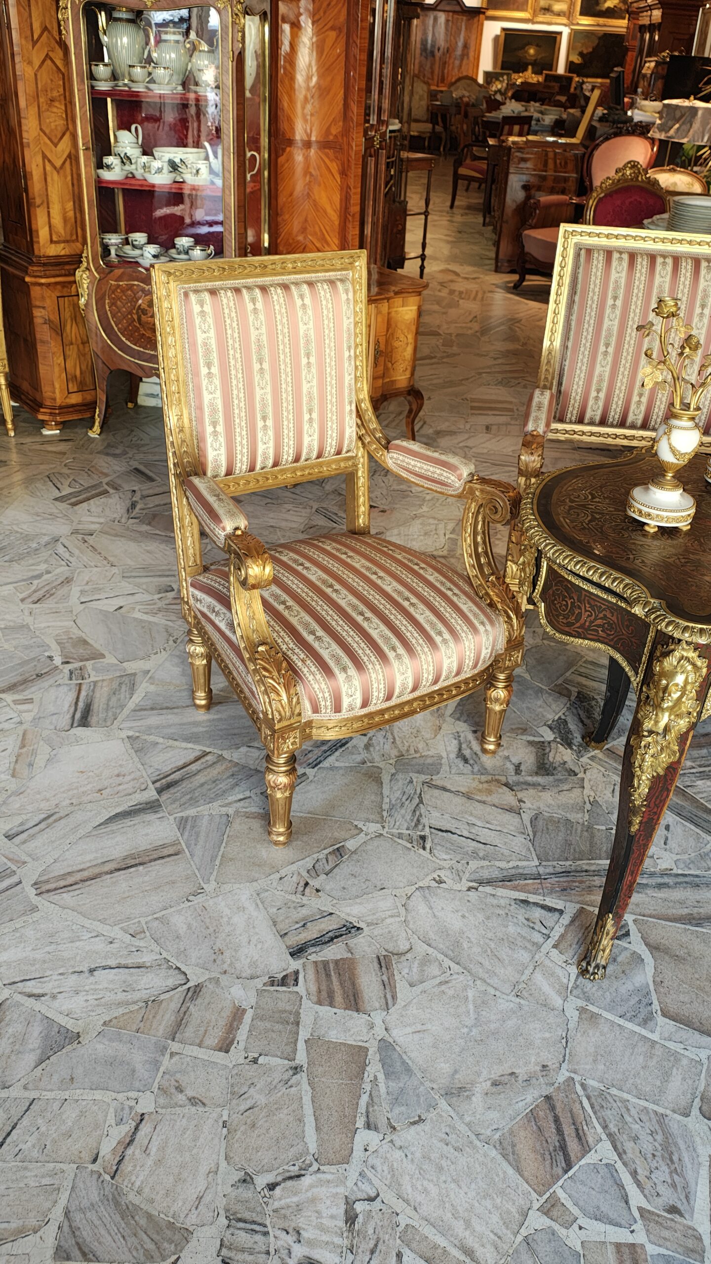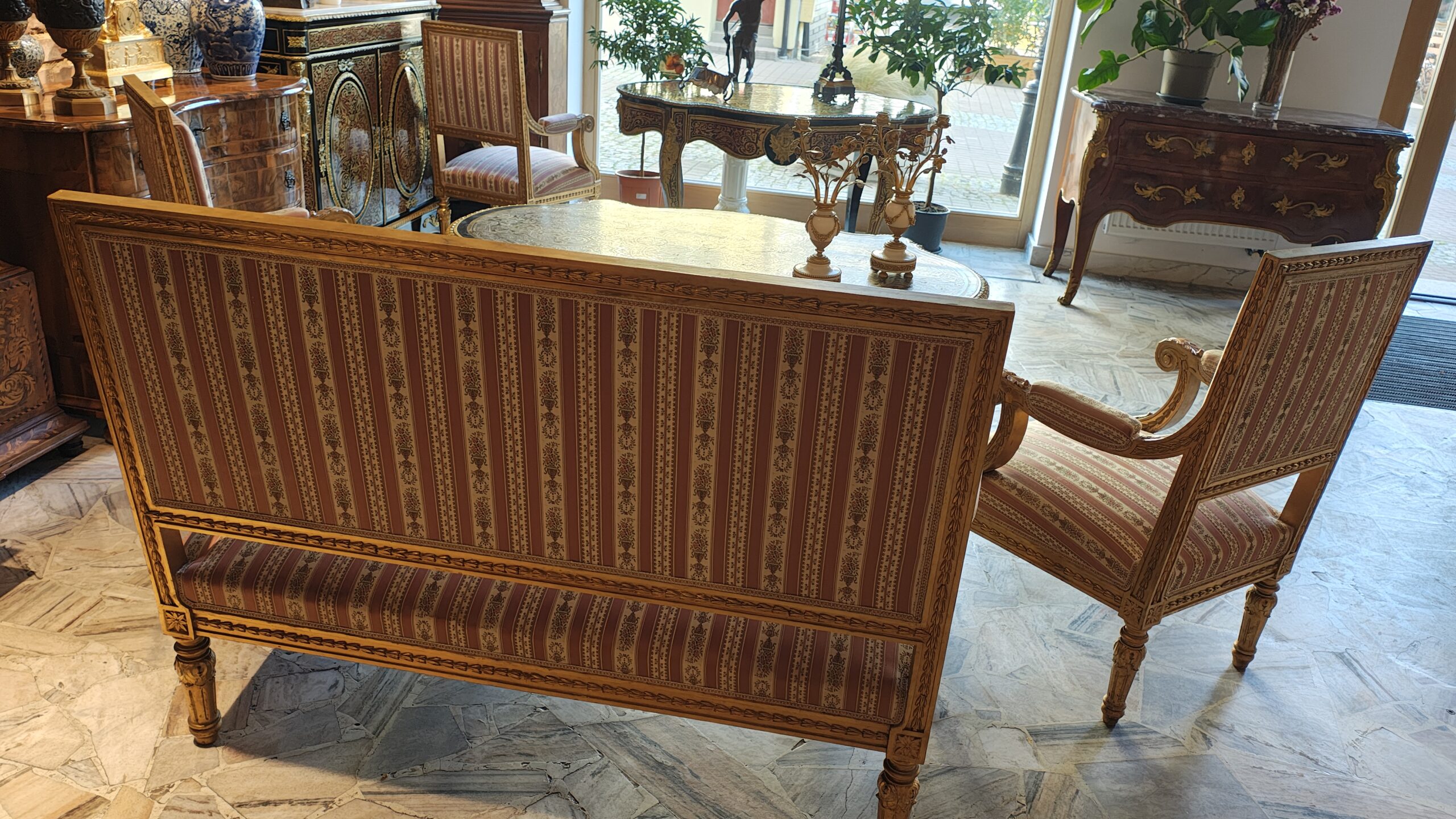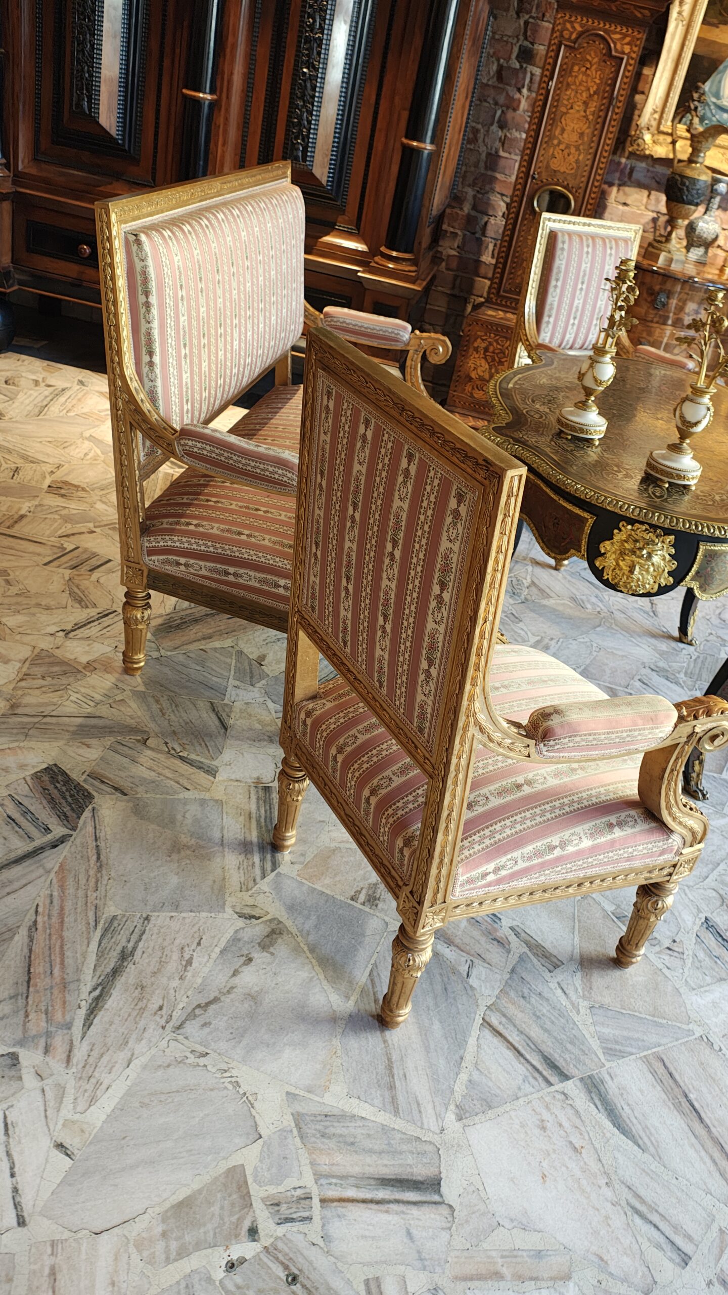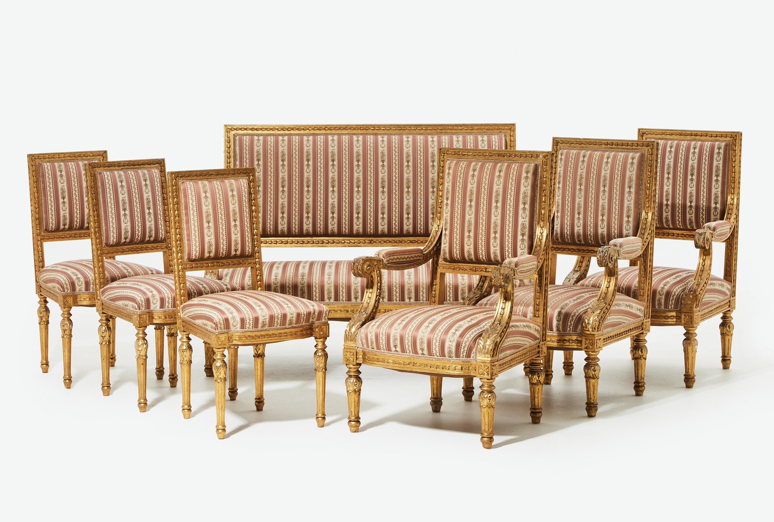 Komplet złożony z trzech tapicerowanych krzeseł, trzech foteli i sofy, rzeźbione, pozłacane. Meble z prostokątnymi oparciami, trapezoidalnymi siedzeniami, wsparte na czterech toczonych nogach, ozdobionych liśćmi akantu. Ramiaki ozdobione szlakiem z liści. W miejscu połączeń kostki z rozetami.