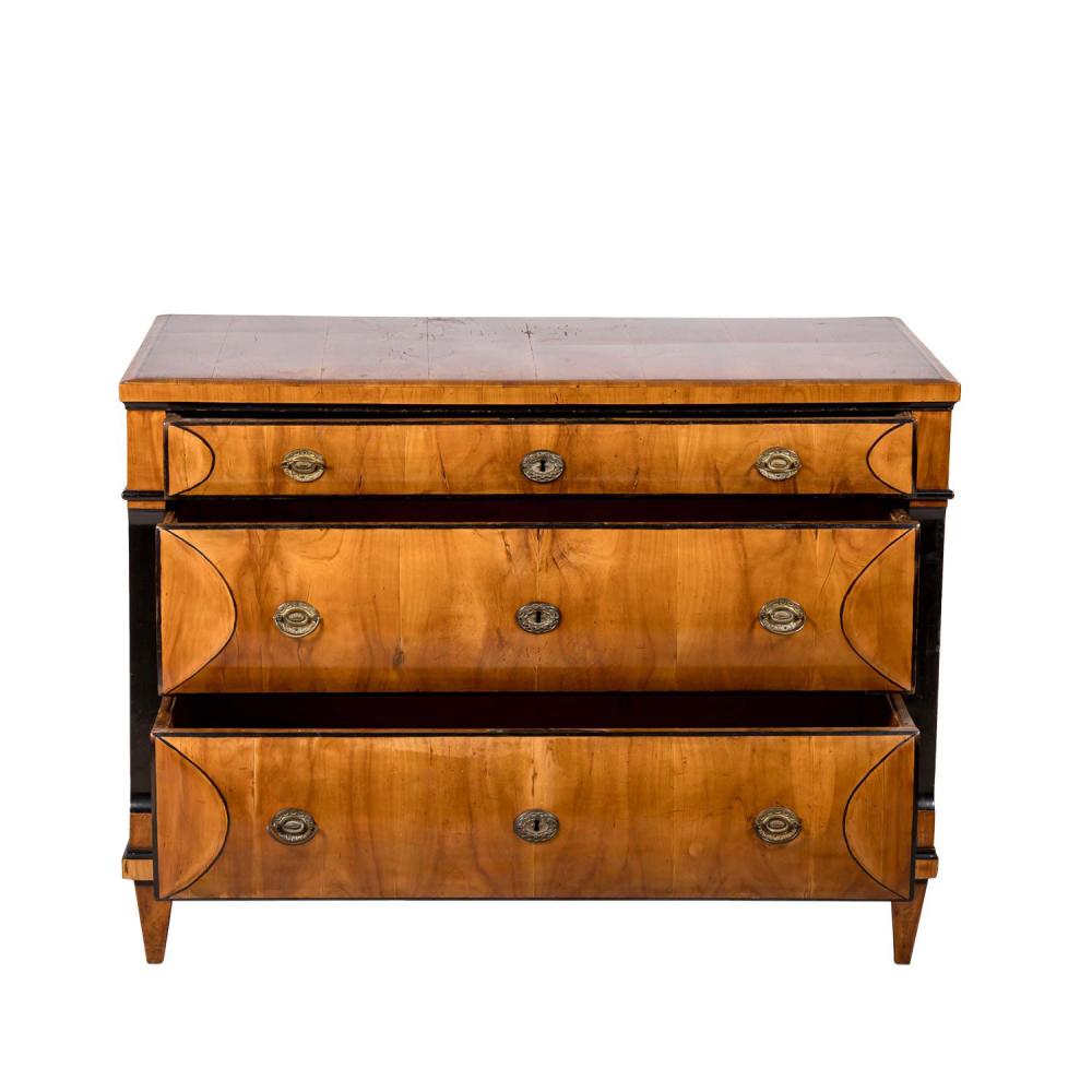 KOMODA BIEDERMEIERSKA Z NIEKONWENCJONALNYMI SZUFLADAMI, 1820-1830, korpus trzyprzęsłowy na stożkowych nogach w kształcie kwadratu, zakrzywione fronty szuflad, hebanowe pilastry osadzone po bokach szuflad, okucia prasowane, wys. x szer. x gł.: 90/122/65 cm. Ślady wieku i użytkowania.