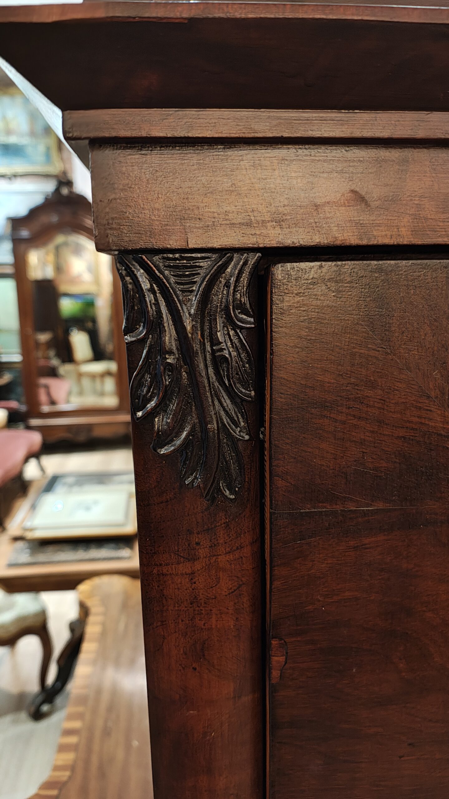 wsparta na konsolowych nogach, w  środku wtórne cztery półki, Plecy piękne dłutowane całość mebla kołkowana.