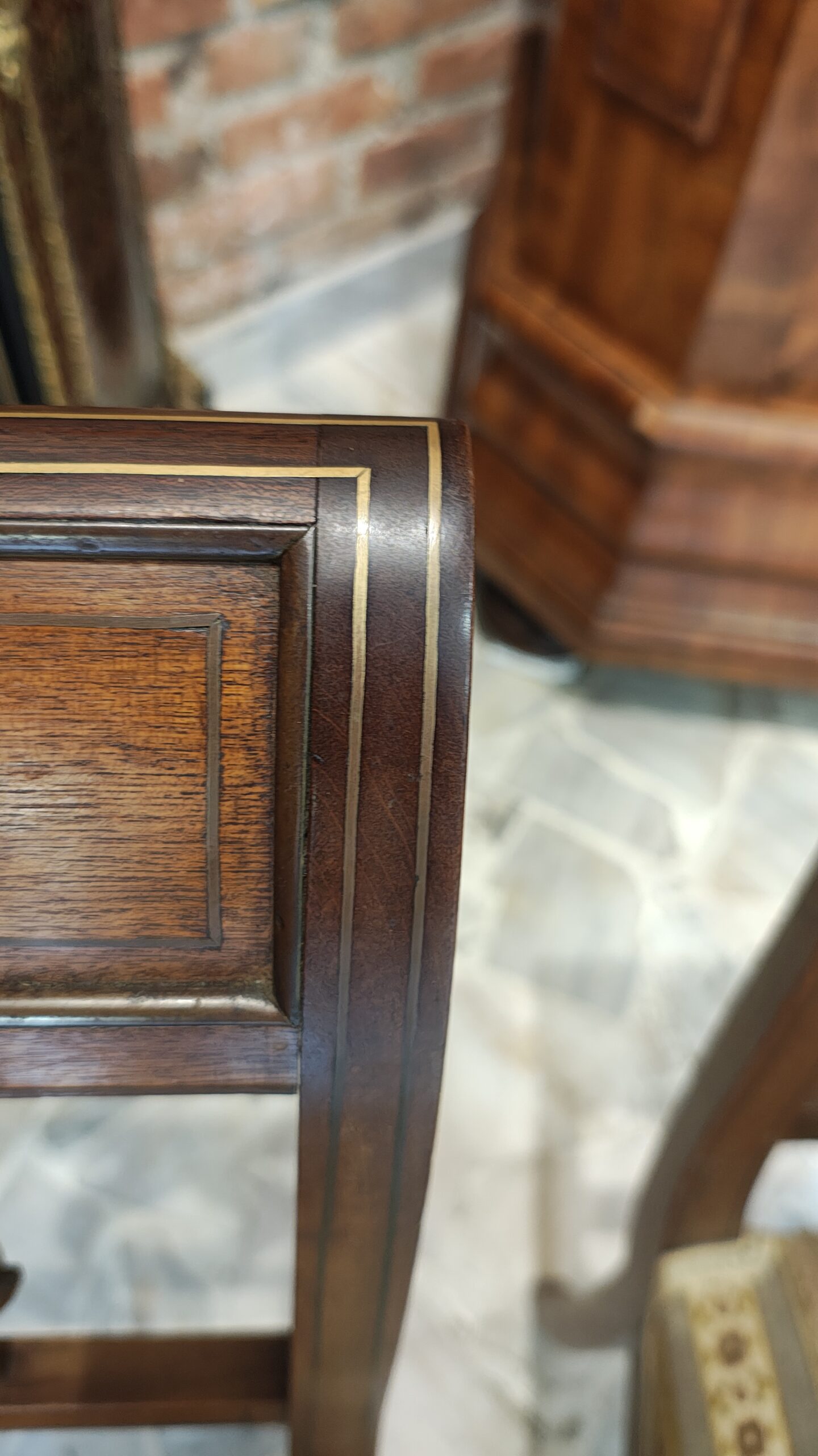 z deskowym oparciem wygiętym łukowo do tyłu, wyściełane poduszką siedzenia, wsparte na czterech deskowych, esowatych nogach, przednich zakończonych lwimi łapami. Deska oparcia ujęta rzeźbionymi ornamentami roślinnymi. W całości inkrustowane żyłką mosiężną.