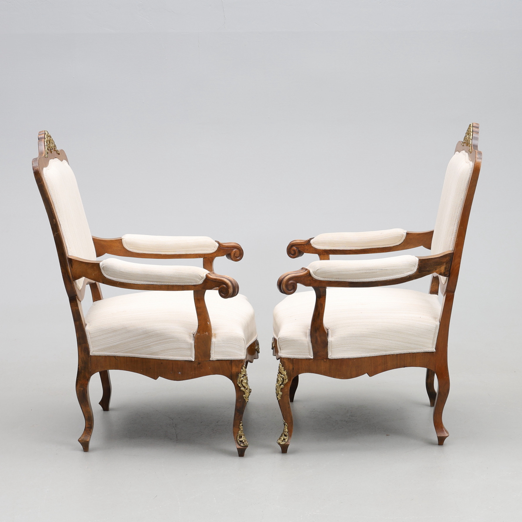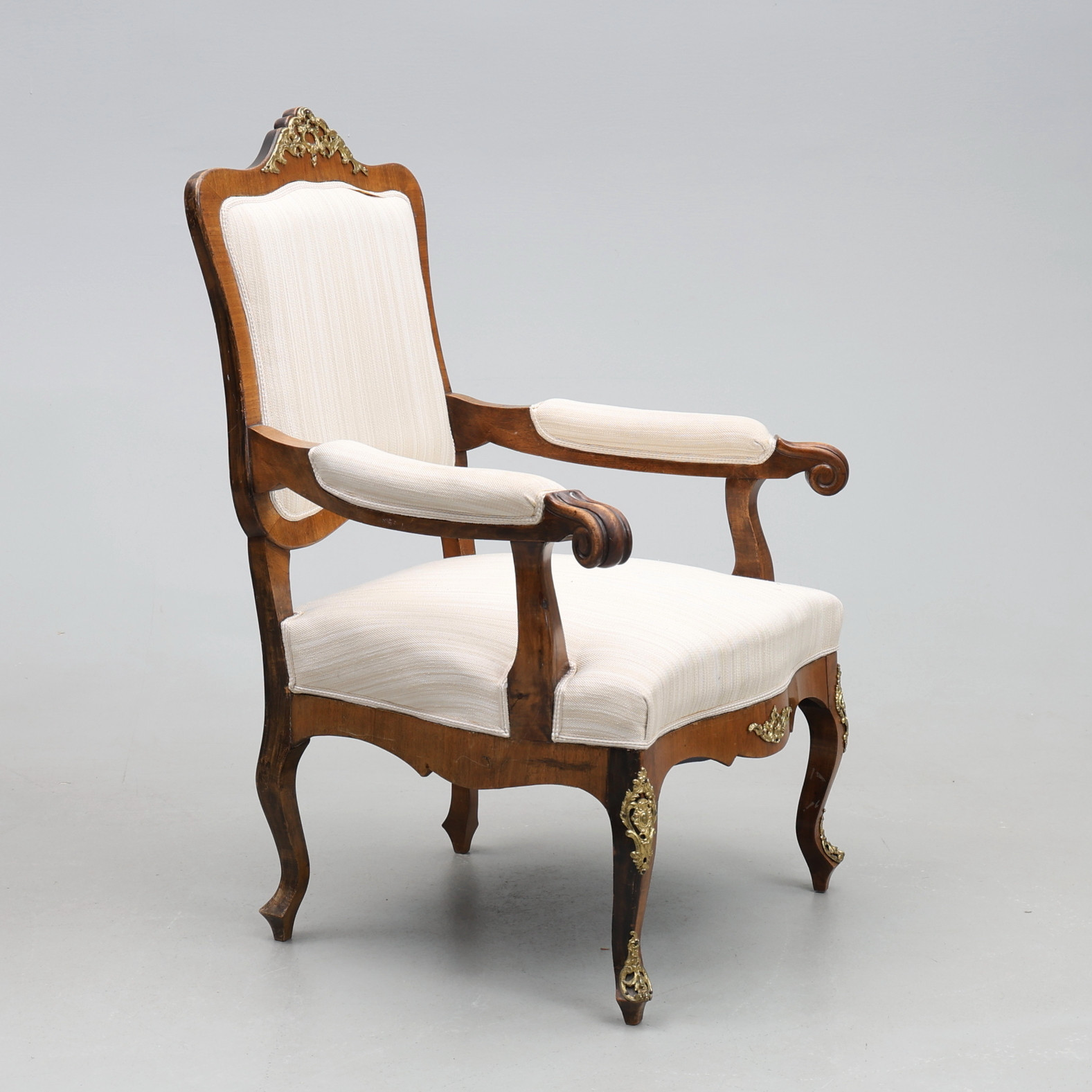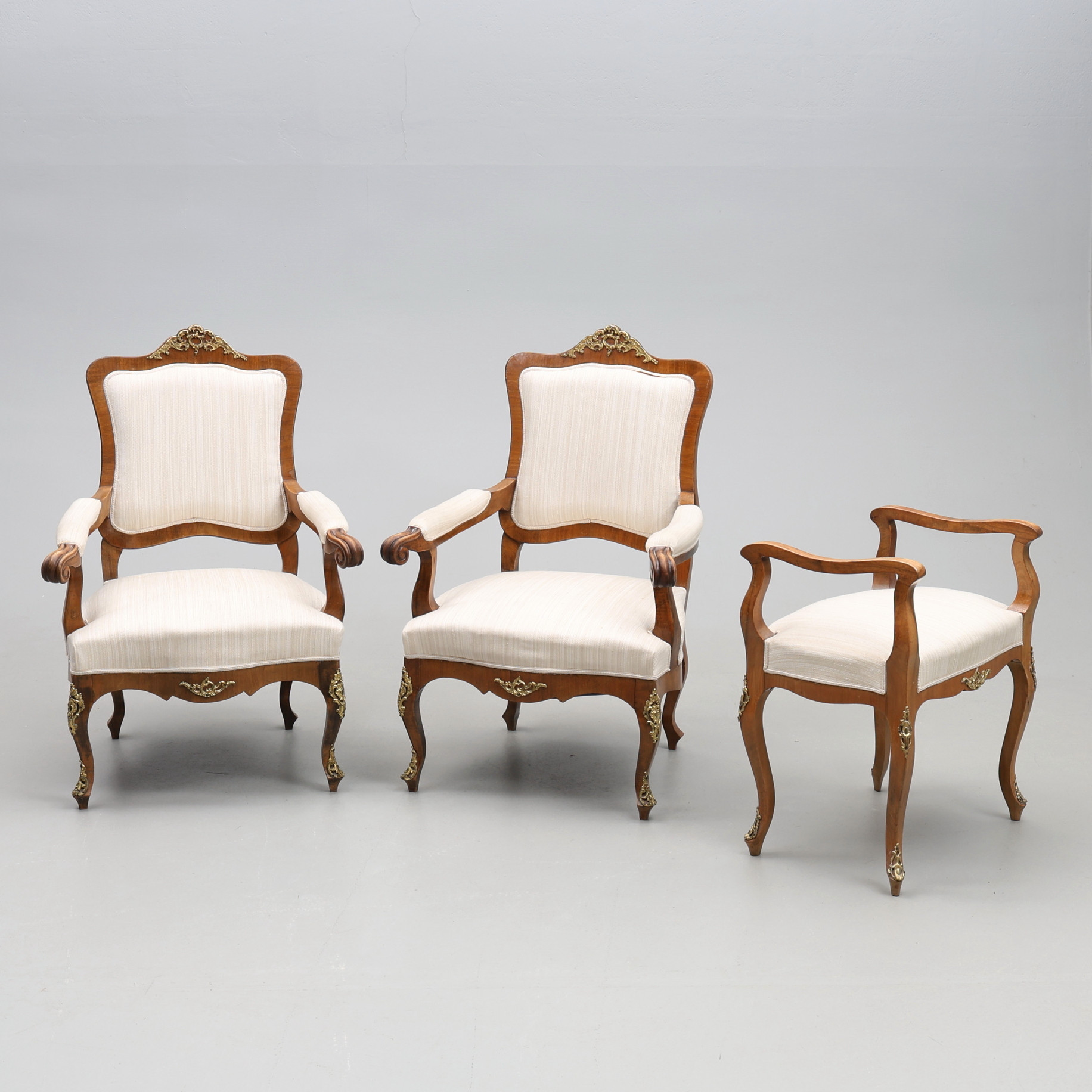 Komplet foteli i berżerki w stylu drezdeńskim. W pełni tapicerowane, na siedziskach sprężyny umieszczone na pasach. Oparcia wszystkich siedzisk delikatnie odchylone do tyłu, także wyścielone materiałem na plecach, podpórki rozchylone na zewnątrz, również tapicerowane. Każdy z mebli z mocno giętymi nóżkami, bogato dekorowane mosiężnymi, ażurowymi aplikacjami. W zwieńczeniu oparcia duże, mosiężne aplikacje w postaci połączonych kwiatków i liści akantu.