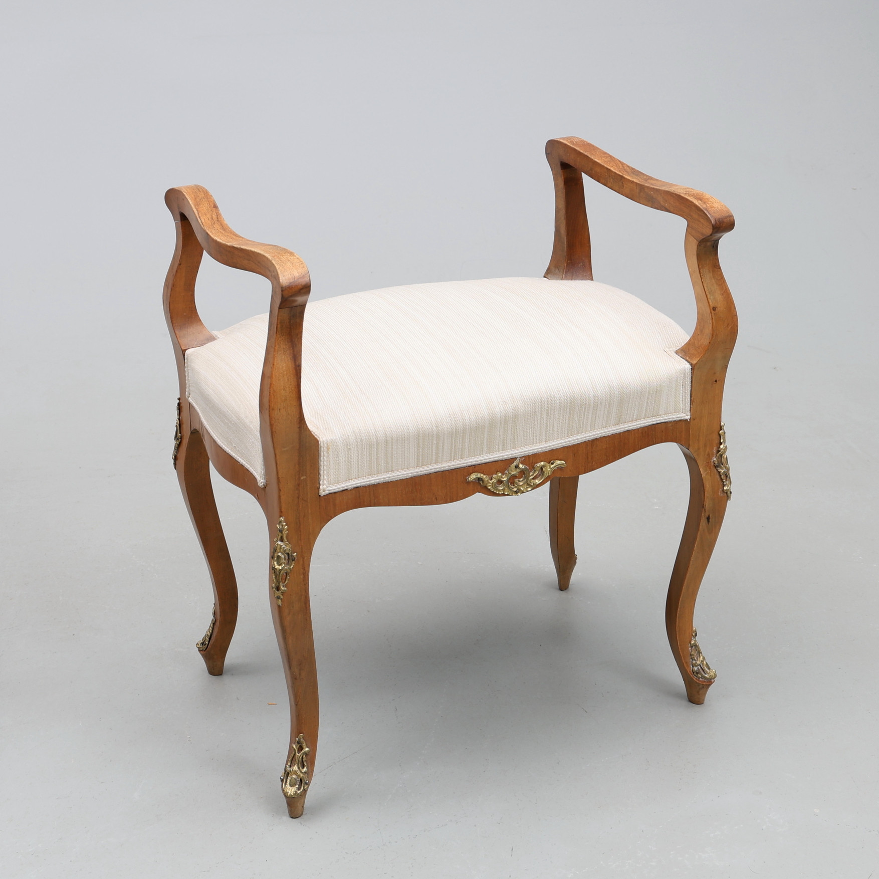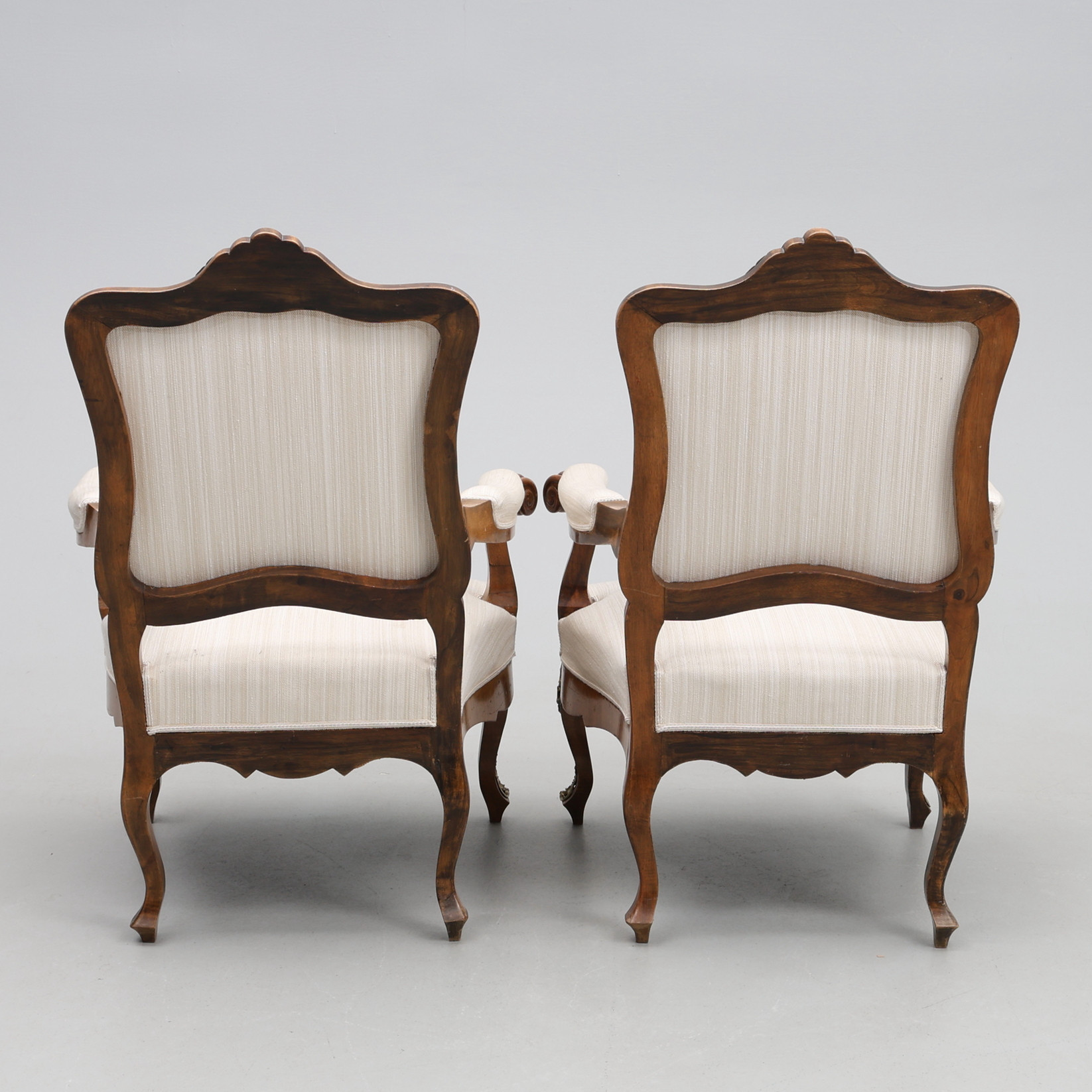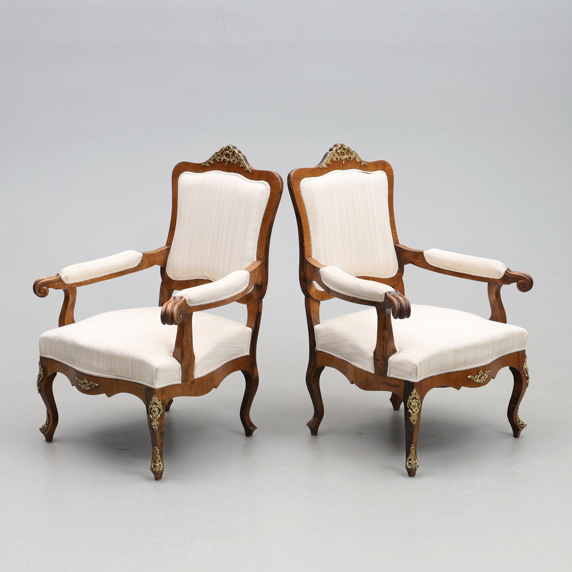 Komplet foteli i berżerki w stylu drezdeńskim. W pełni tapicerowane, na siedziskach sprężyny umieszczone na pasach. Oparcia wszystkich siedzisk delikatnie odchylone do tyłu, także wyścielone materiałem na plecach, podpórki rozchylone na zewnątrz, również tapicerowane. Każdy z mebli z mocno giętymi nóżkami, bogato dekorowane mosiężnymi, ażurowymi aplikacjami. W zwieńczeniu oparcia duże, mosiężne aplikacje w postaci połączonych kwiatków i liści akantu.