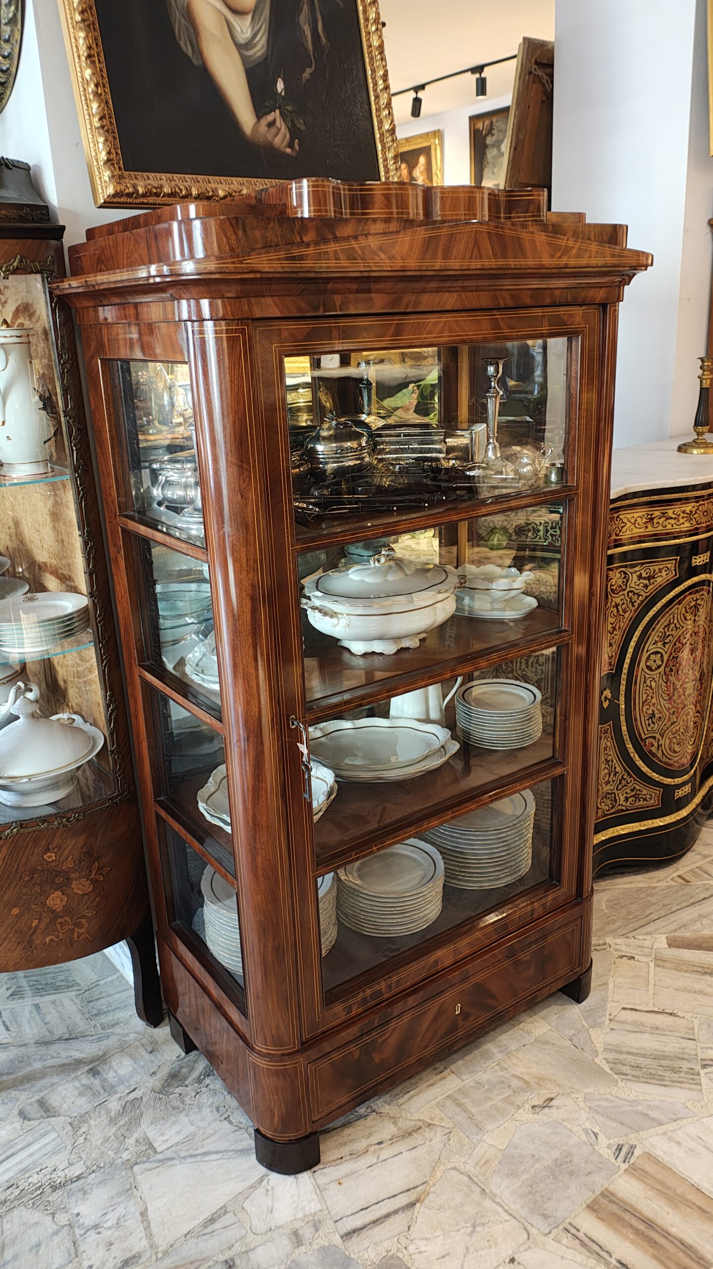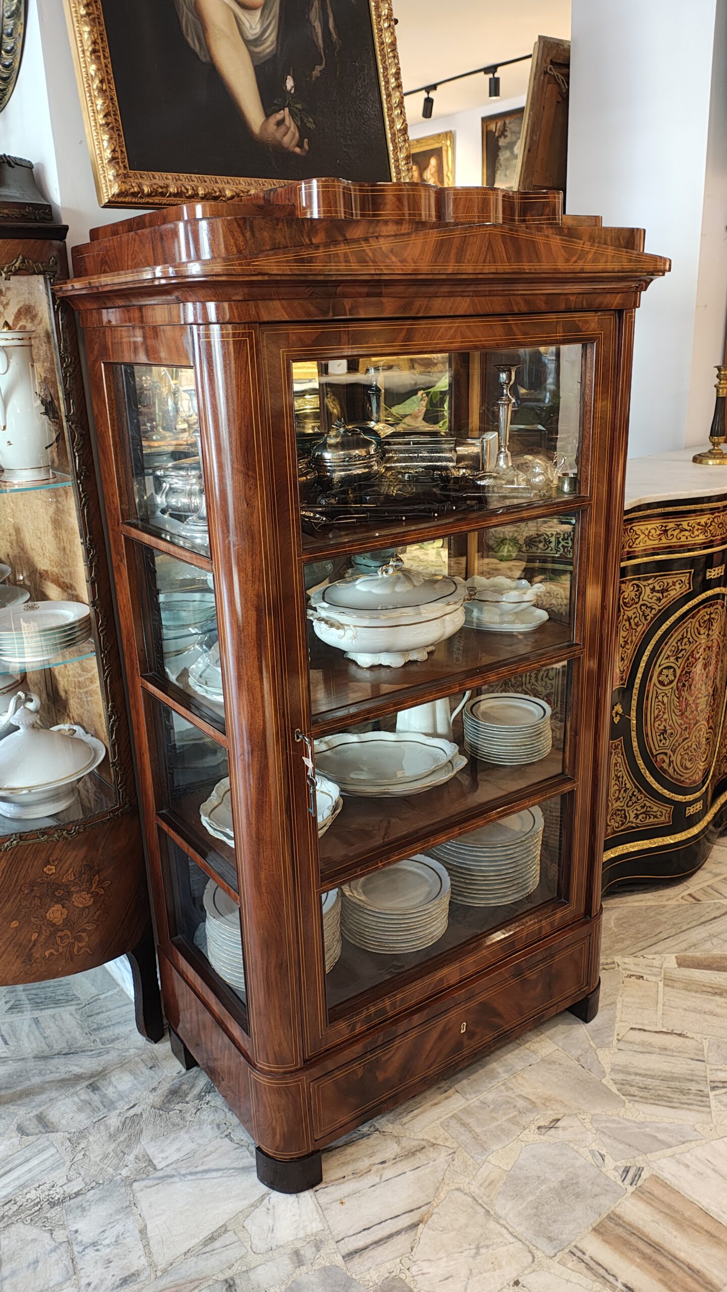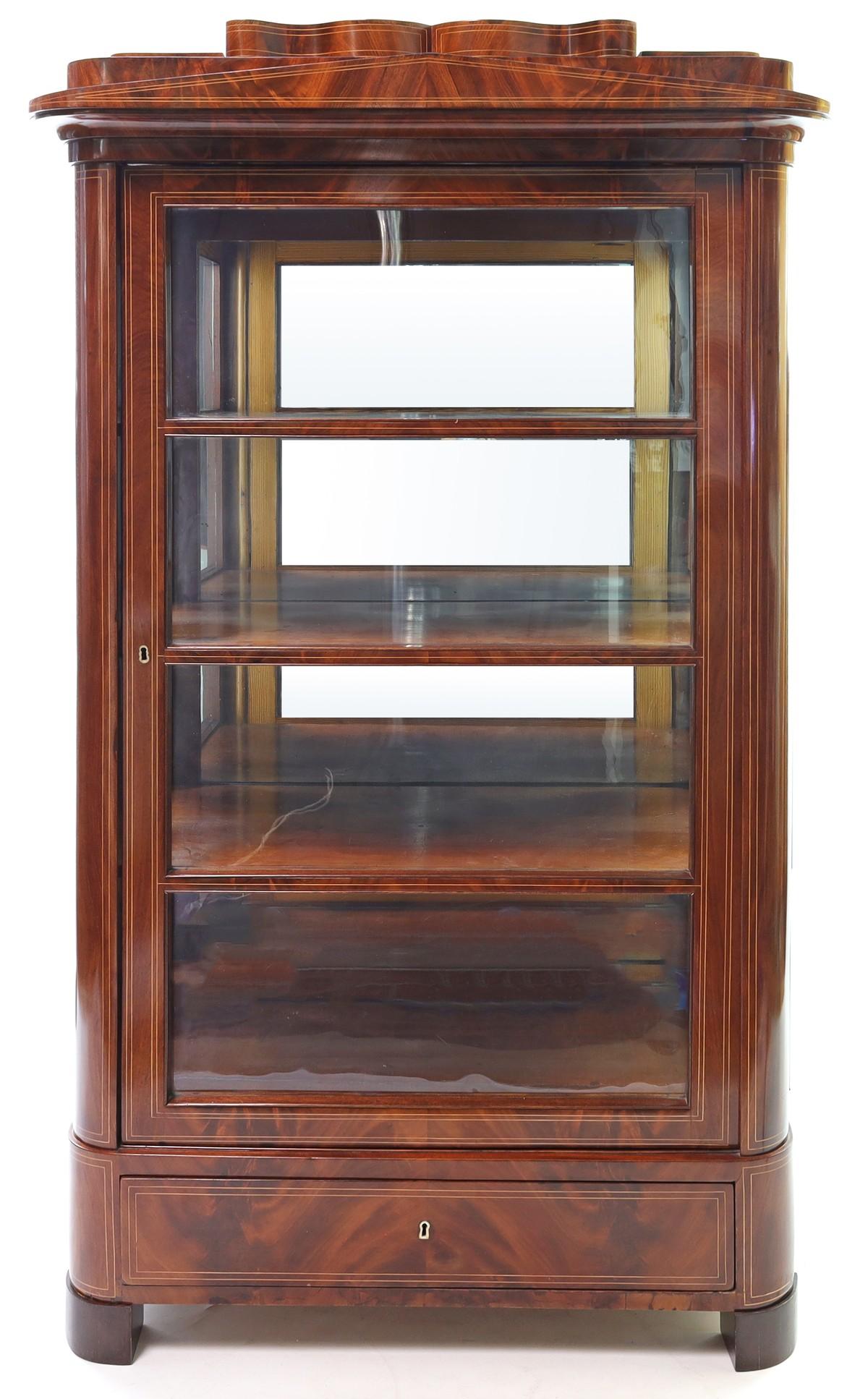 Wsparta na 4 nóżkach klockowych (frontowe wyoblone). Całość prostopadłościenna, naroża zaokrąglone. W zabudowanej podstawie – szuflada. Część górna prostopadłościenna, z trzech stron oszklona. Drzwiczki i ścianki boczne podzielone poziomymi szprosami, zamknięte u góry nieznacznym łukiem. Zwieńczenie z profilowanym gzymsem i niewielkim ozdobnym wypiętrzeniem schodkowym, zaokrąglonym od frontu. Wewnątrz trzy półki, tylna ściana pokryta taflami lustrzanymi. Daszek rozbudowany, z wypukłą schodkową konchą pośrodku, ujętą ściankami i profilowanymi kasetonami na bokach. We wnętrzu trzy bardzo wysokie półki. Wsparta na 4 nóżkach klockowych (frontowe wyoblone).