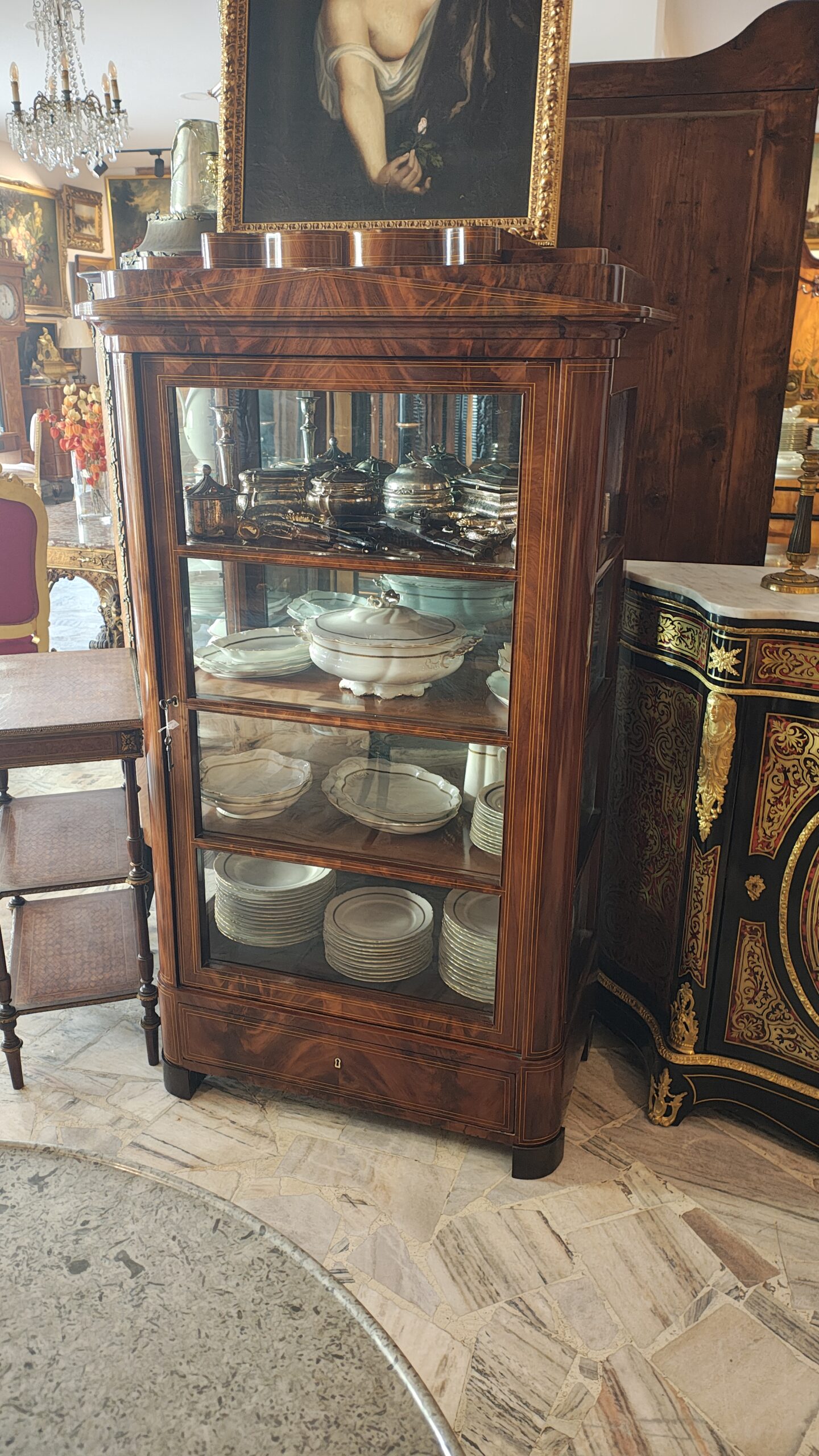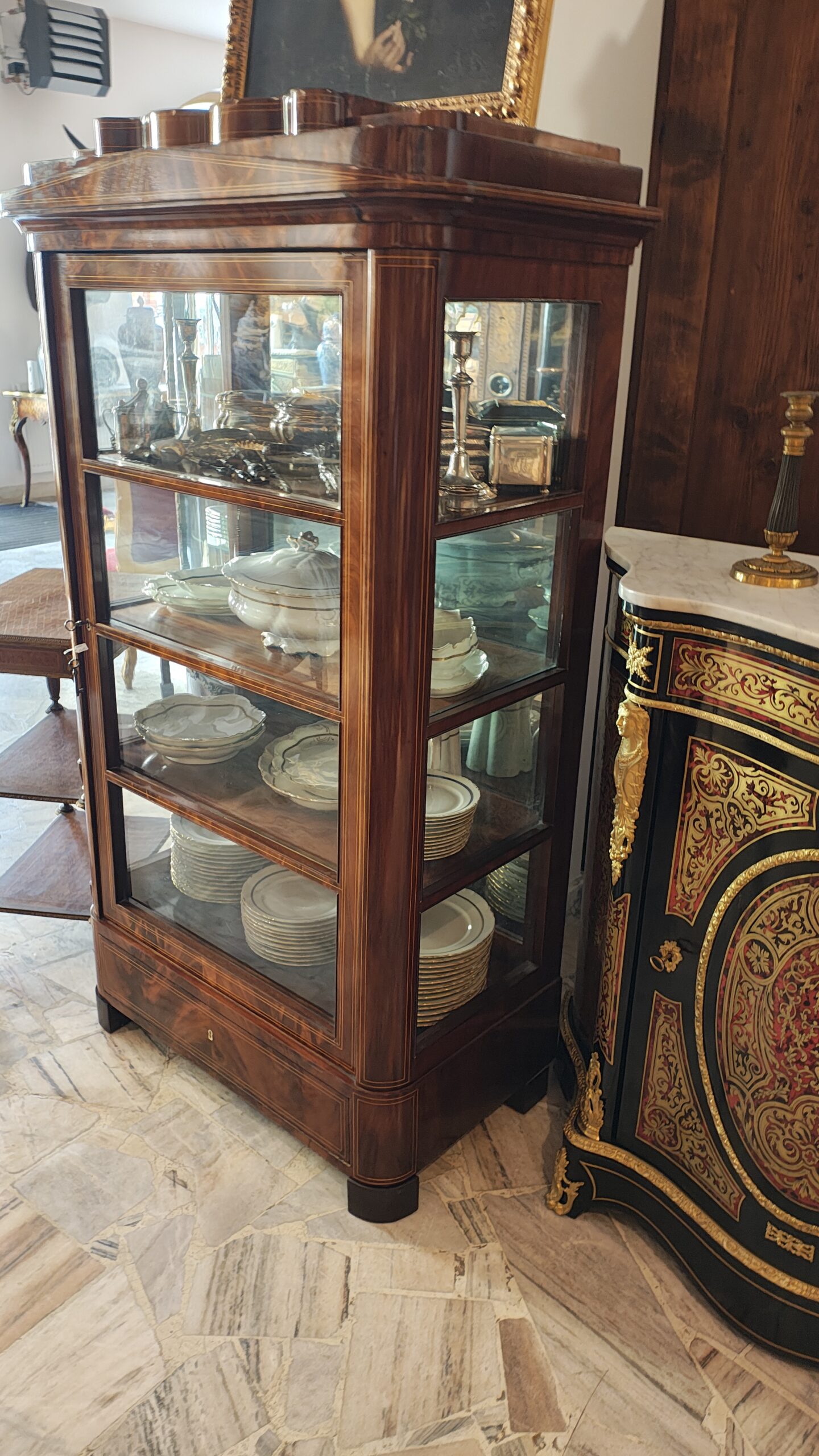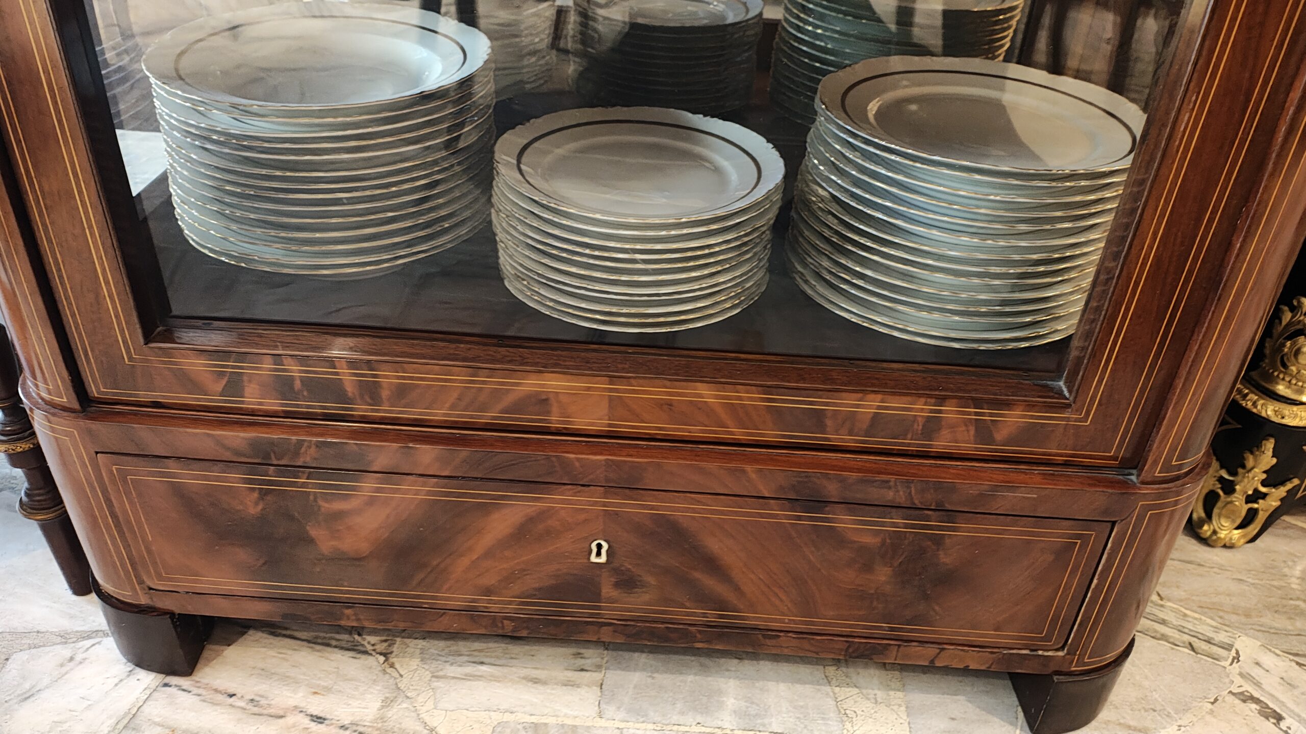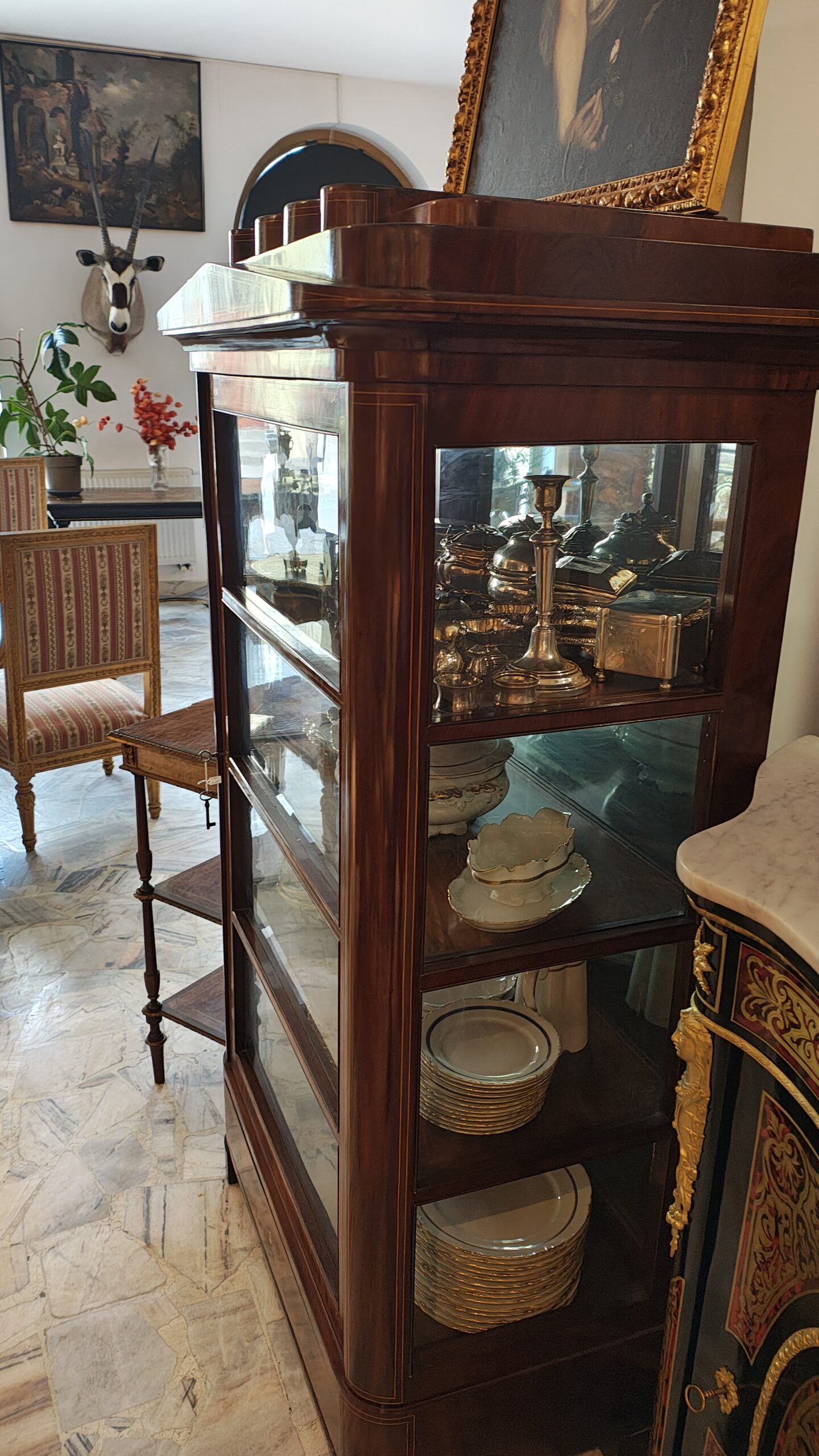 Wsparta na 4 nóżkach klockowych (frontowe wyoblone). Całość prostopadłościenna, naroża zaokrąglone. W zabudowanej podstawie – szuflada. Część górna prostopadłościenna, z trzech stron oszklona. Drzwiczki i ścianki boczne podzielone poziomymi szprosami, zamknięte u góry nieznacznym łukiem. Zwieńczenie z profilowanym gzymsem i niewielkim ozdobnym wypiętrzeniem schodkowym, zaokrąglonym od frontu. Wewnątrz trzy półki, tylna ściana pokryta taflami lustrzanymi. Daszek rozbudowany, z wypukłą schodkową konchą pośrodku, ujętą ściankami i profilowanymi kasetonami na bokach. We wnętrzu trzy bardzo wysokie półki. Wsparta na 4 nóżkach klockowych (frontowe wyoblone).