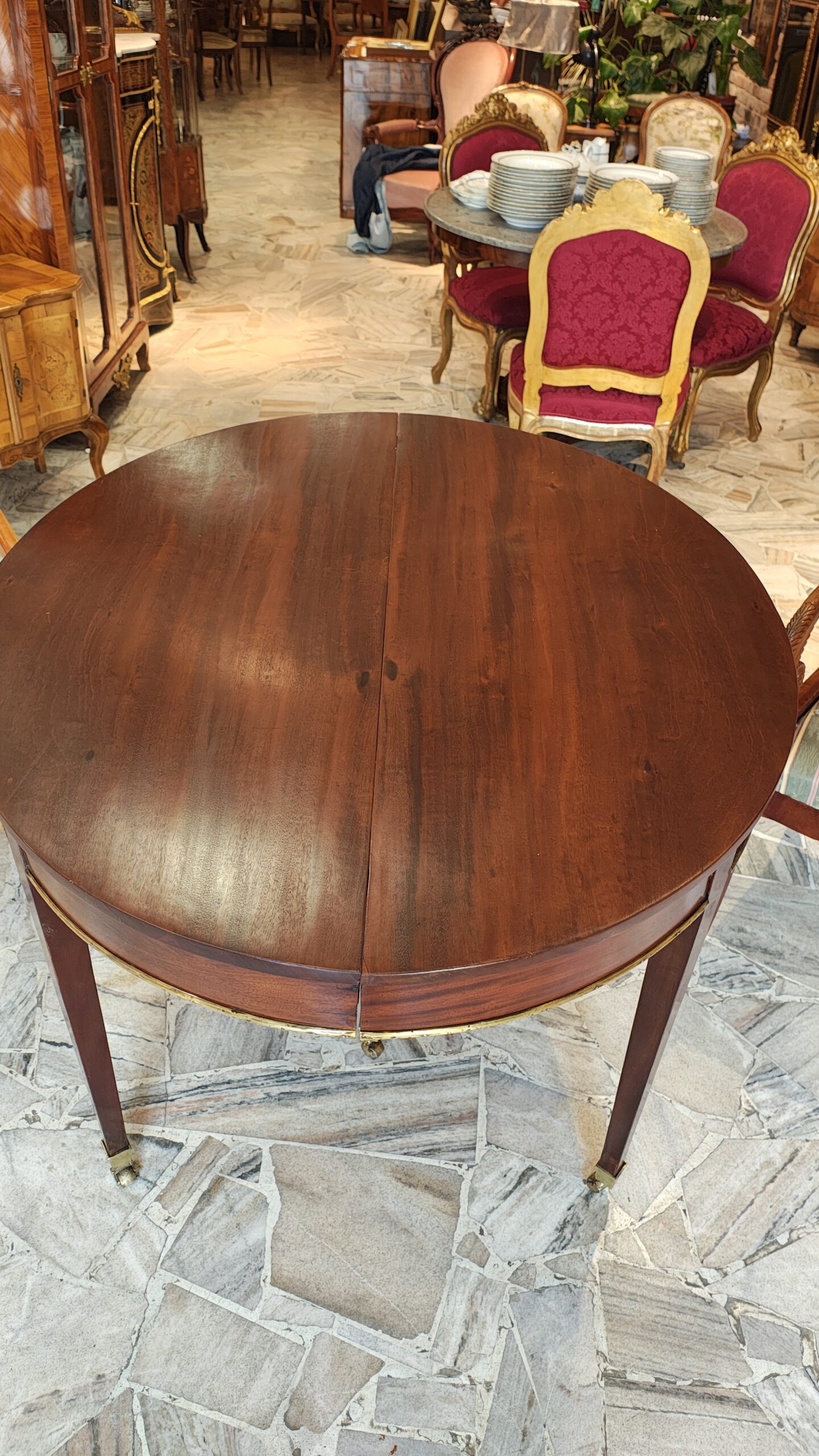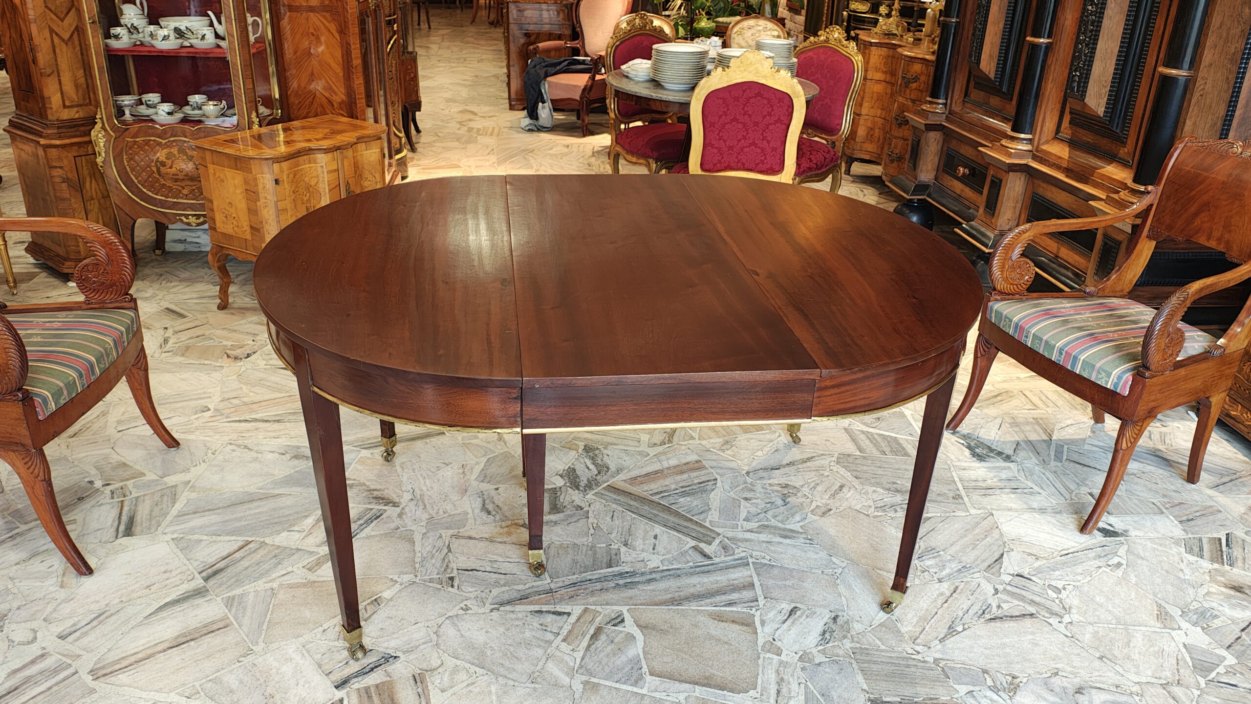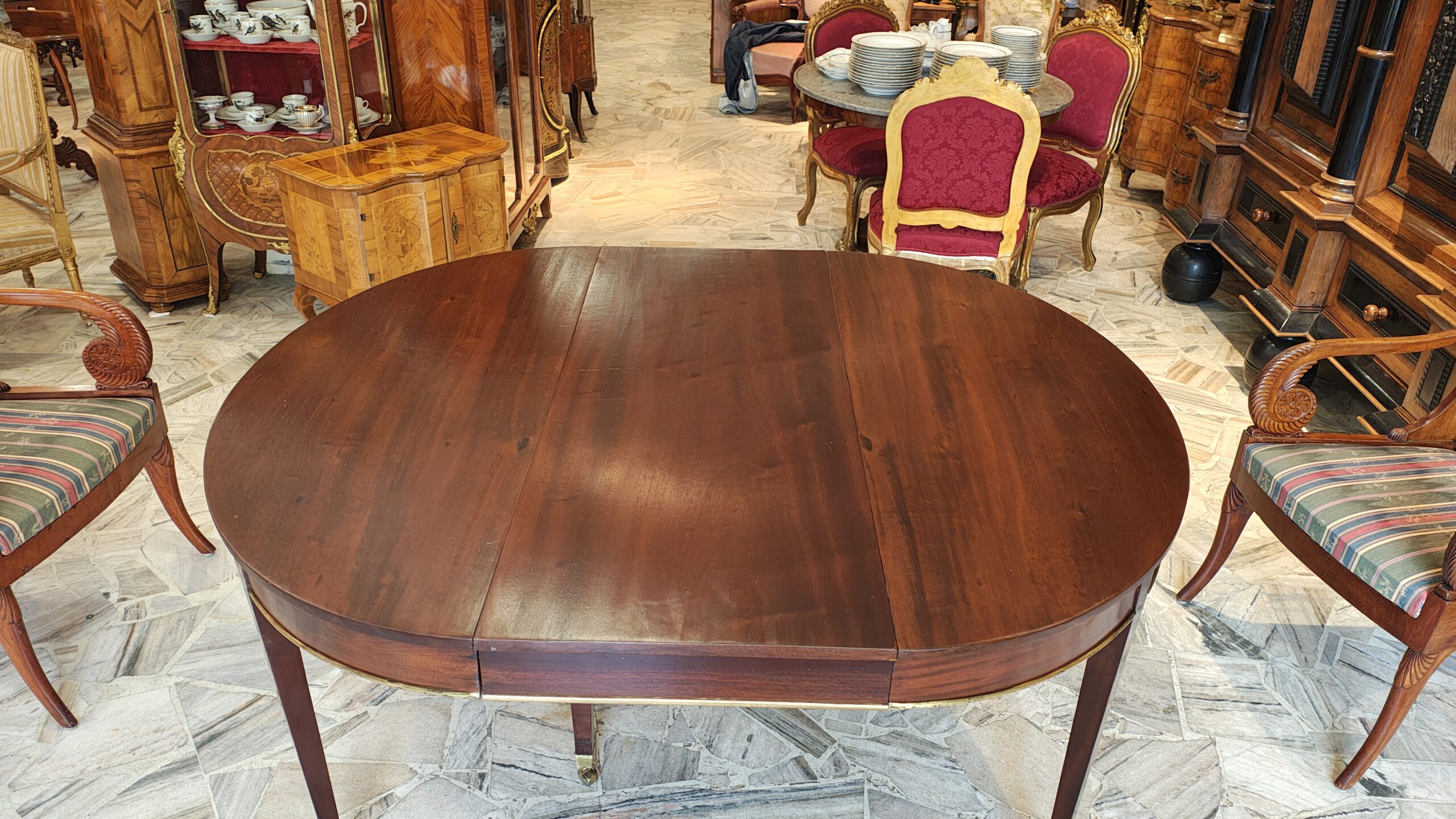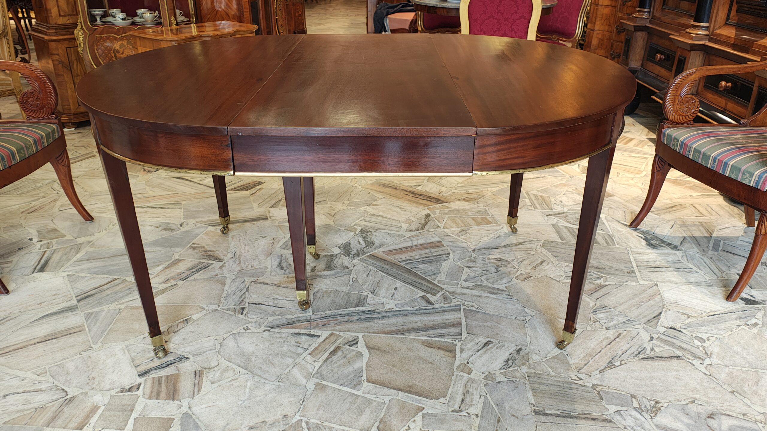 Stół rozkładany klasycystyczny z jednym wkładem, stół z przystosowaniem na kilka wkładów, które można dorobić. Na obręczy stołu wykończenie obwódką z brązu złoconego. podobnie wykończenie nóżek stemple z kółkami.