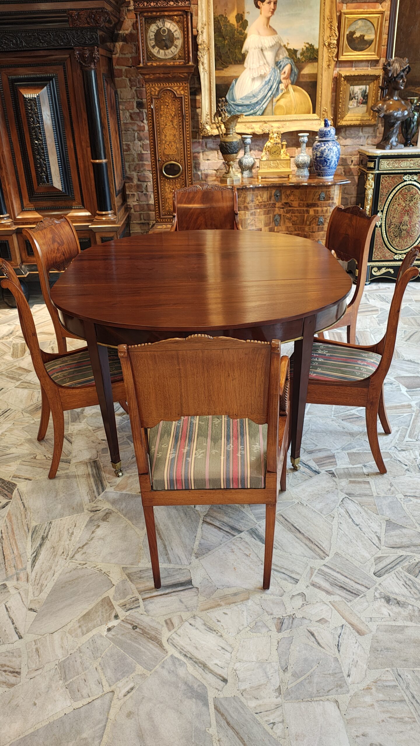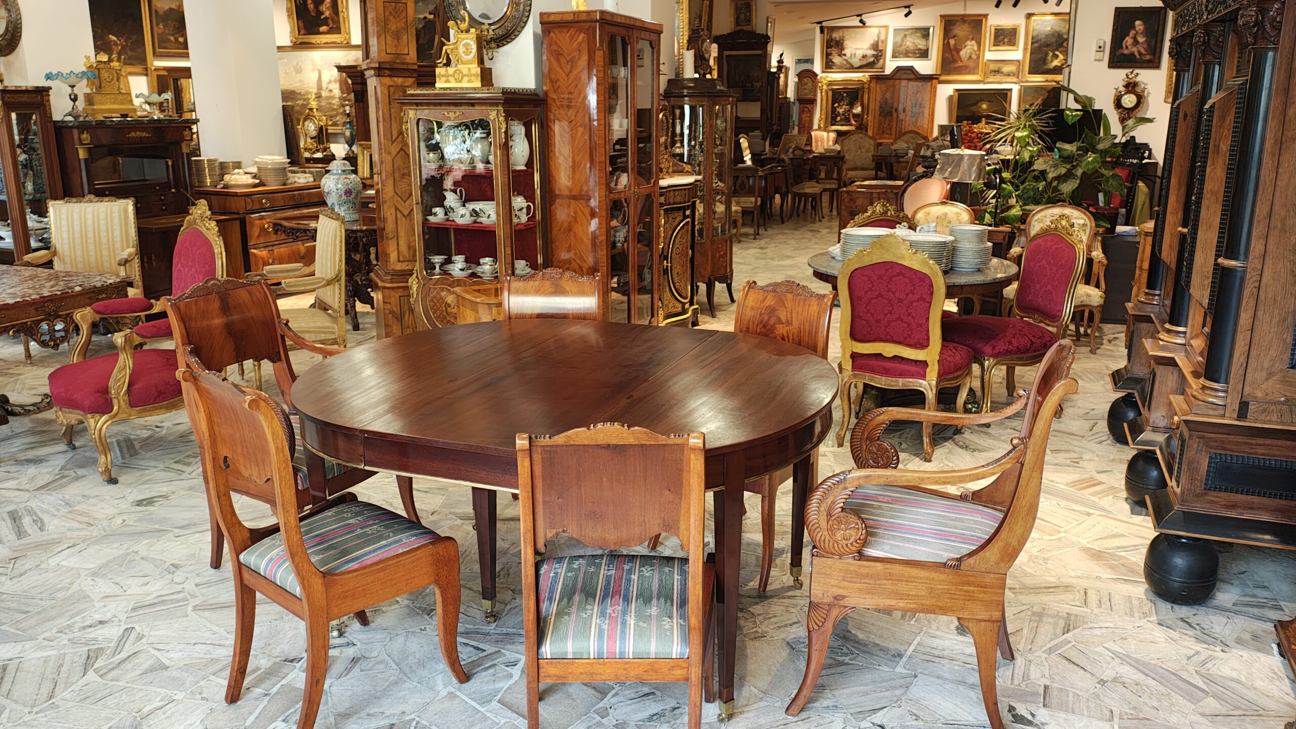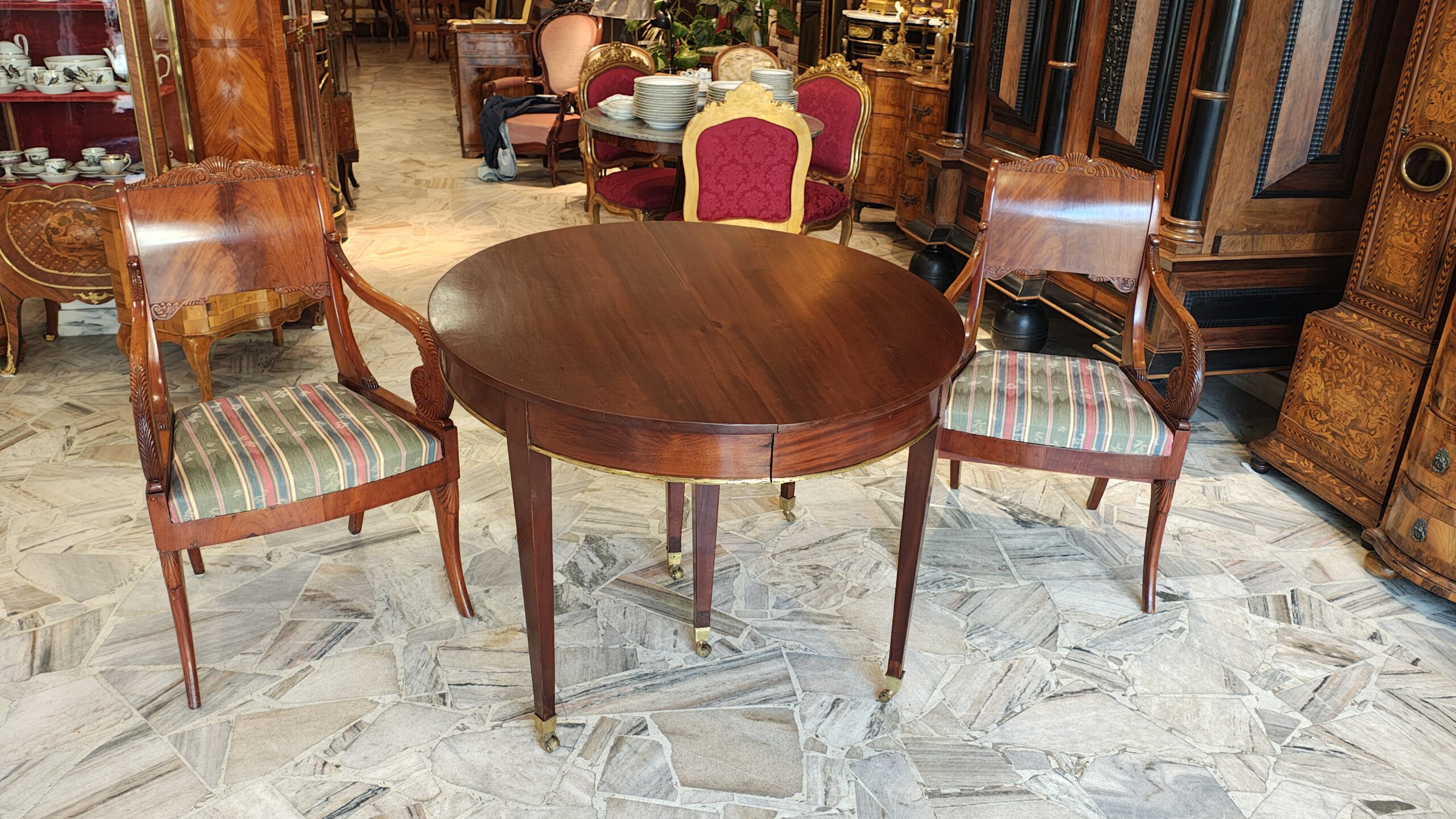 Stół rozkładany klasycystyczny z jednym wkładem, stół z przystosowaniem na kilka wkładów, które można dorobić. Na obręczy stołu wykończenie obwódką z brązu złoconego. podobnie wykończenie nóżek stemple z kółkami.