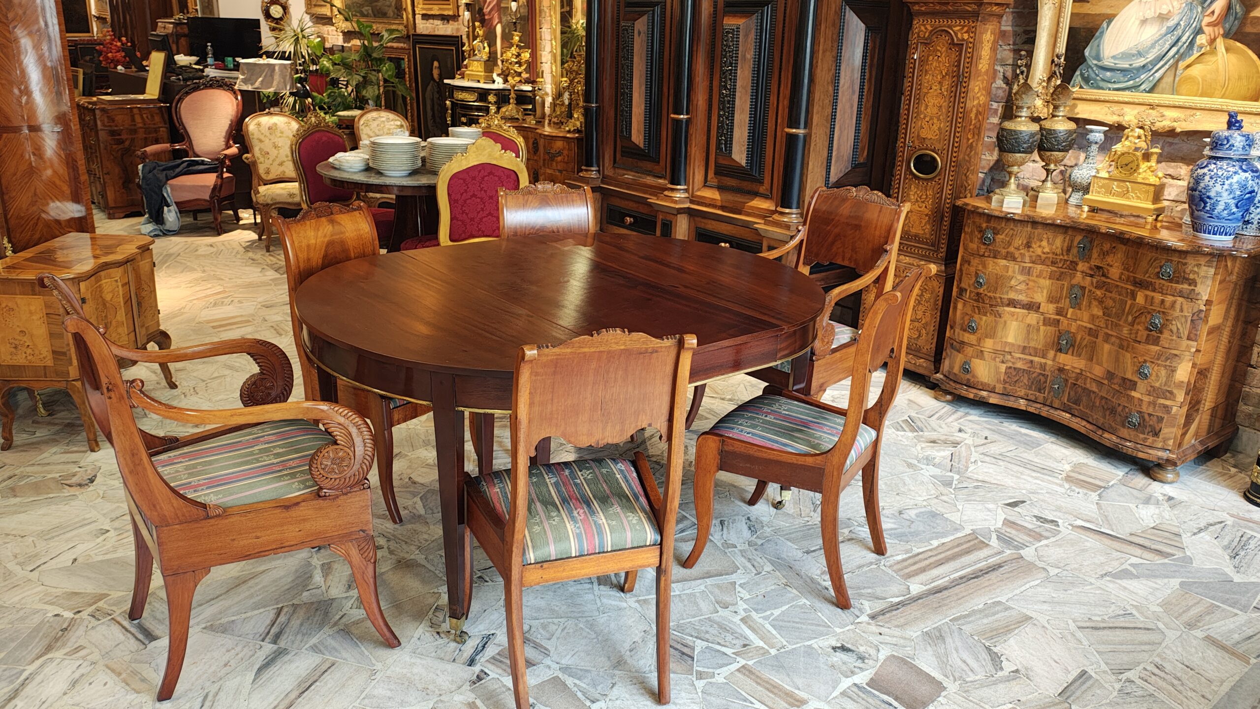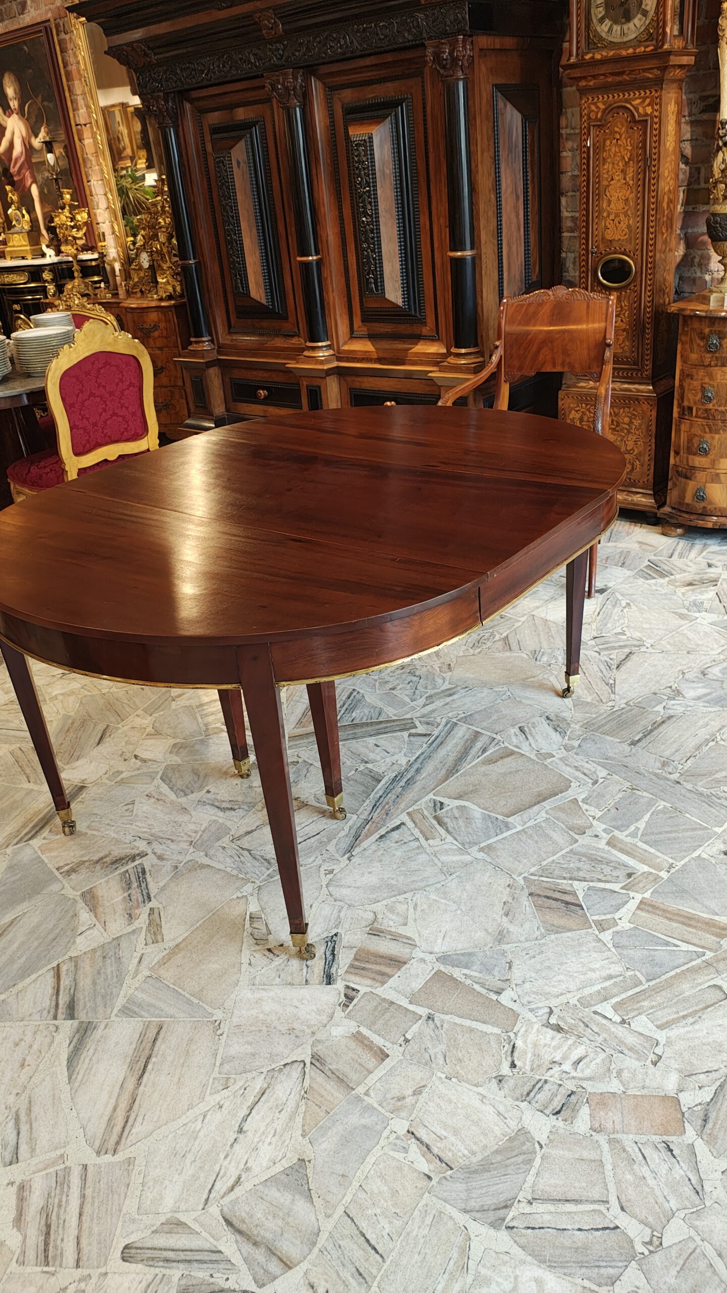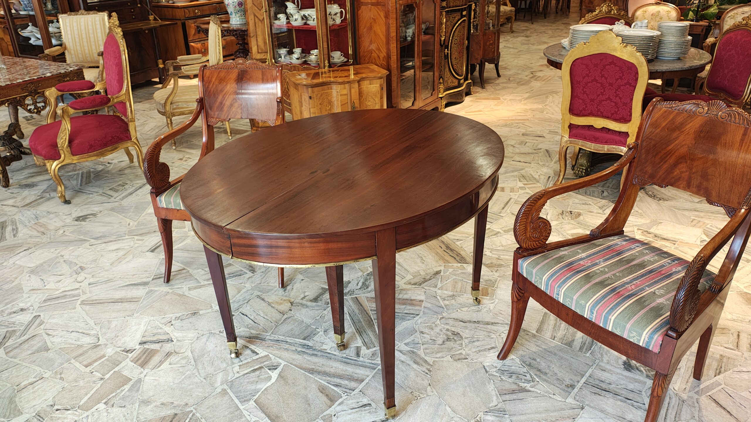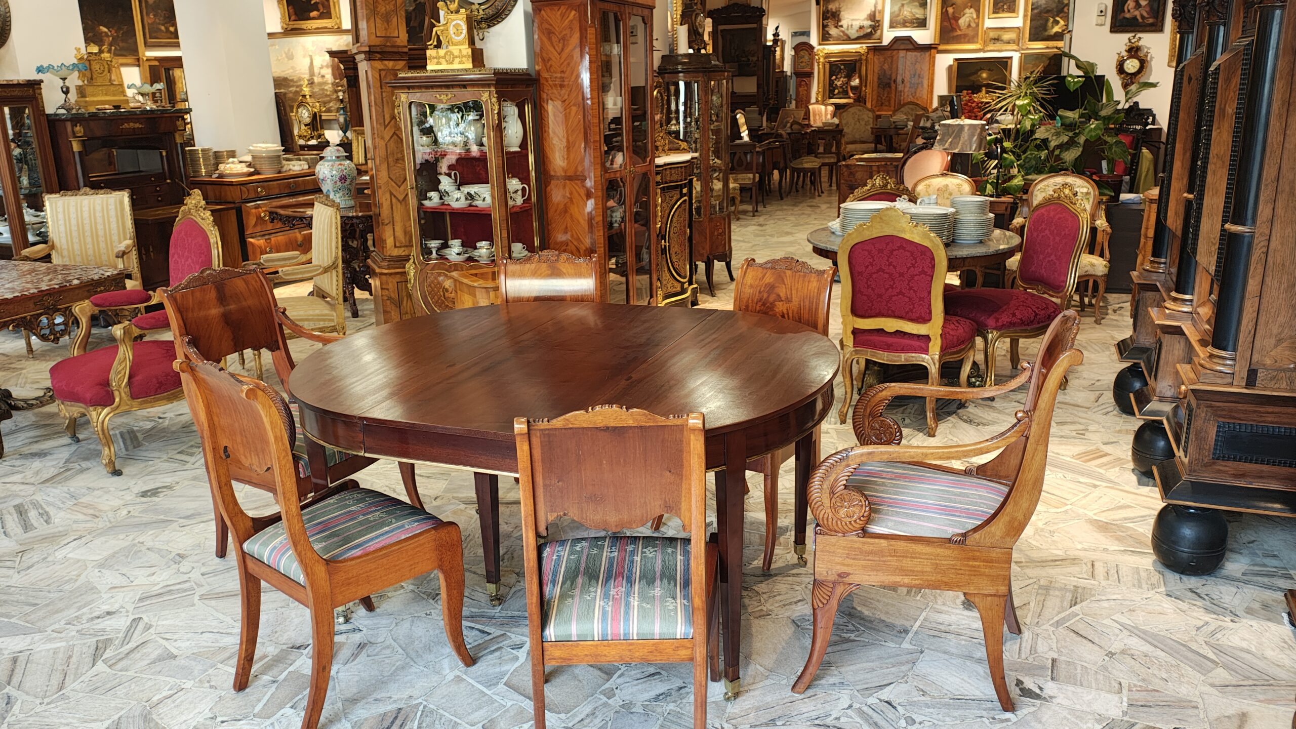 Stół rozkładany klasycystyczny z jednym wkładem, stół z przystosowaniem na kilka wkładów, które można dorobić. Na obręczy stołu wykończenie obwódką z brązu złoconego. podobnie wykończenie nóżek stemple z kółkami.