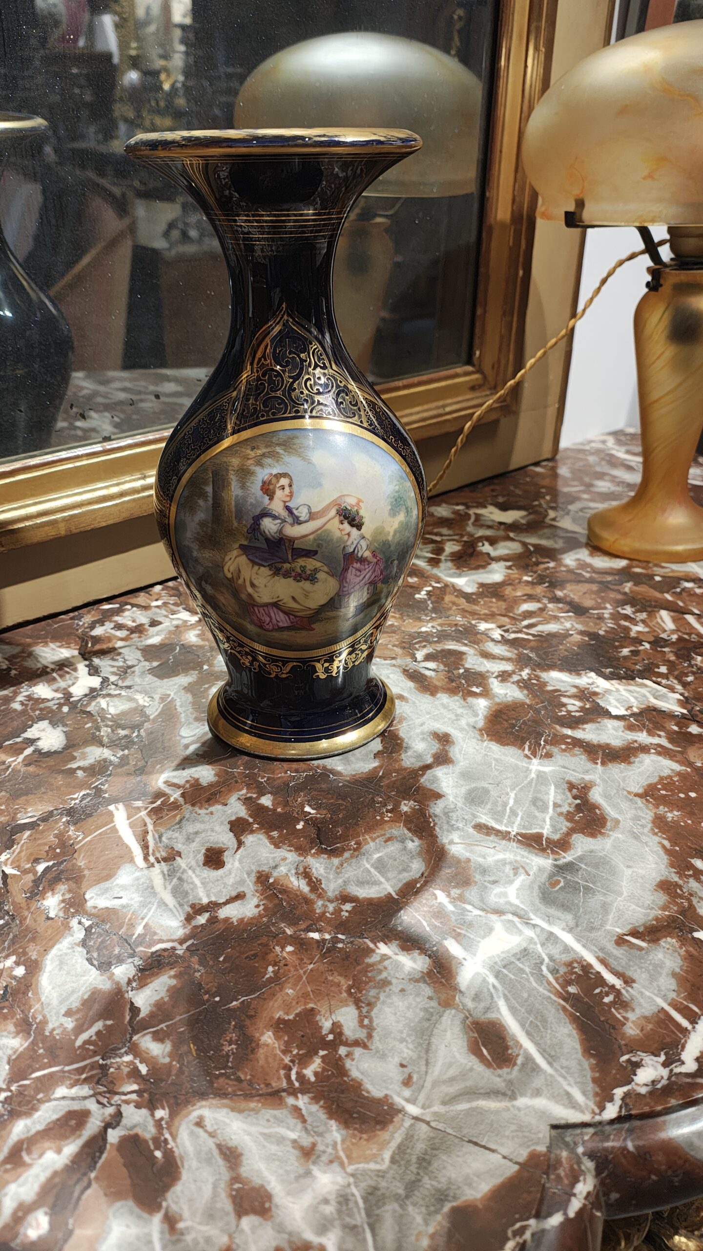 Wazon kobaltowy z dekoracją w postaci scenki romantycznej Niebieski obraz ze stylizowanymi kwiatami, owocami i ptakami. Korpus żebrowany, wieczko z rączką w kształcie psa.