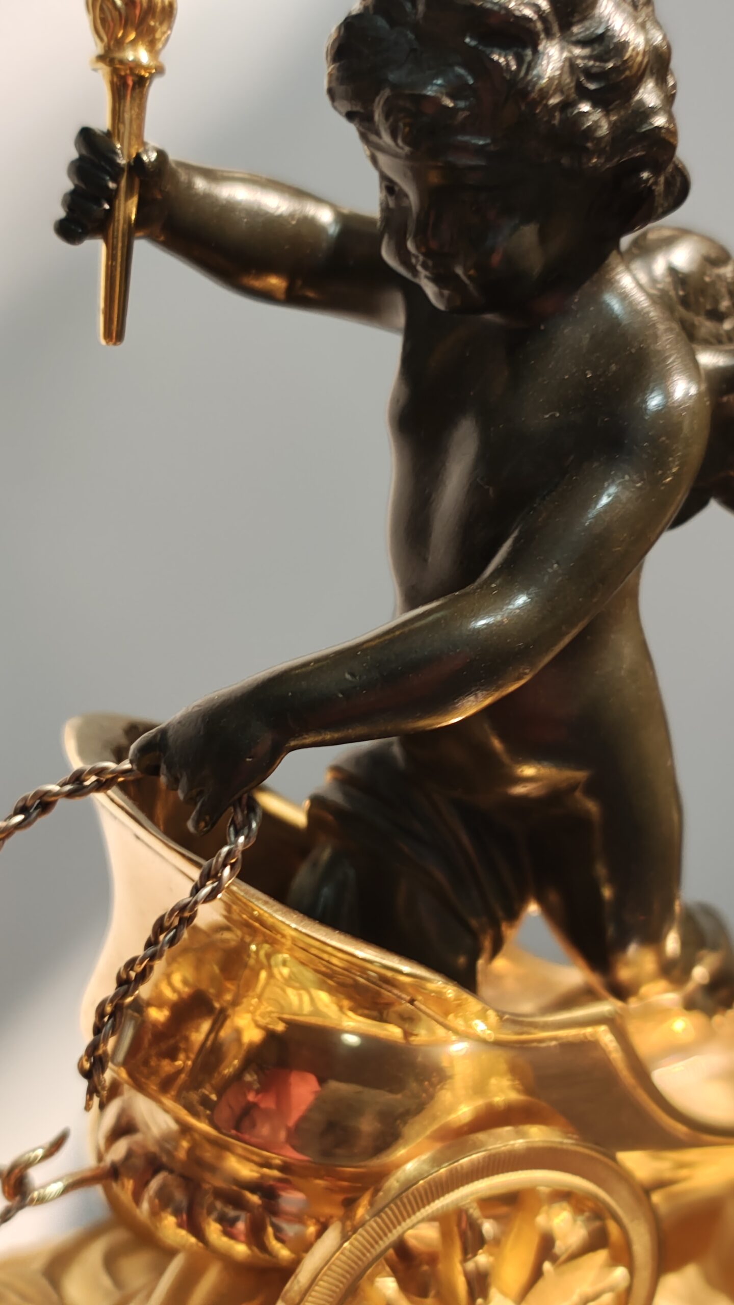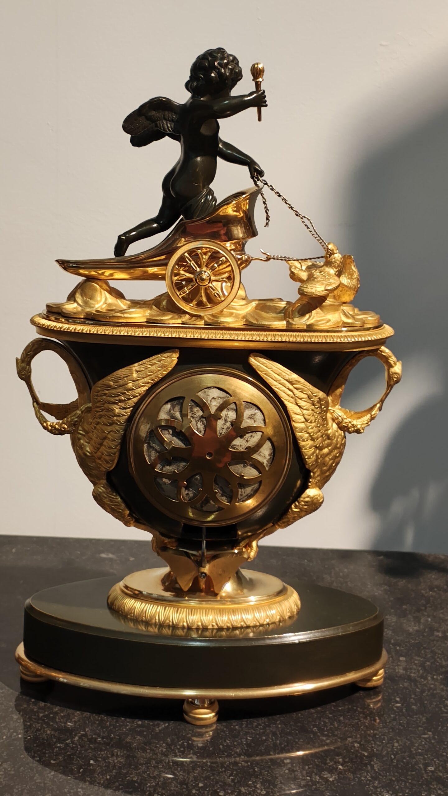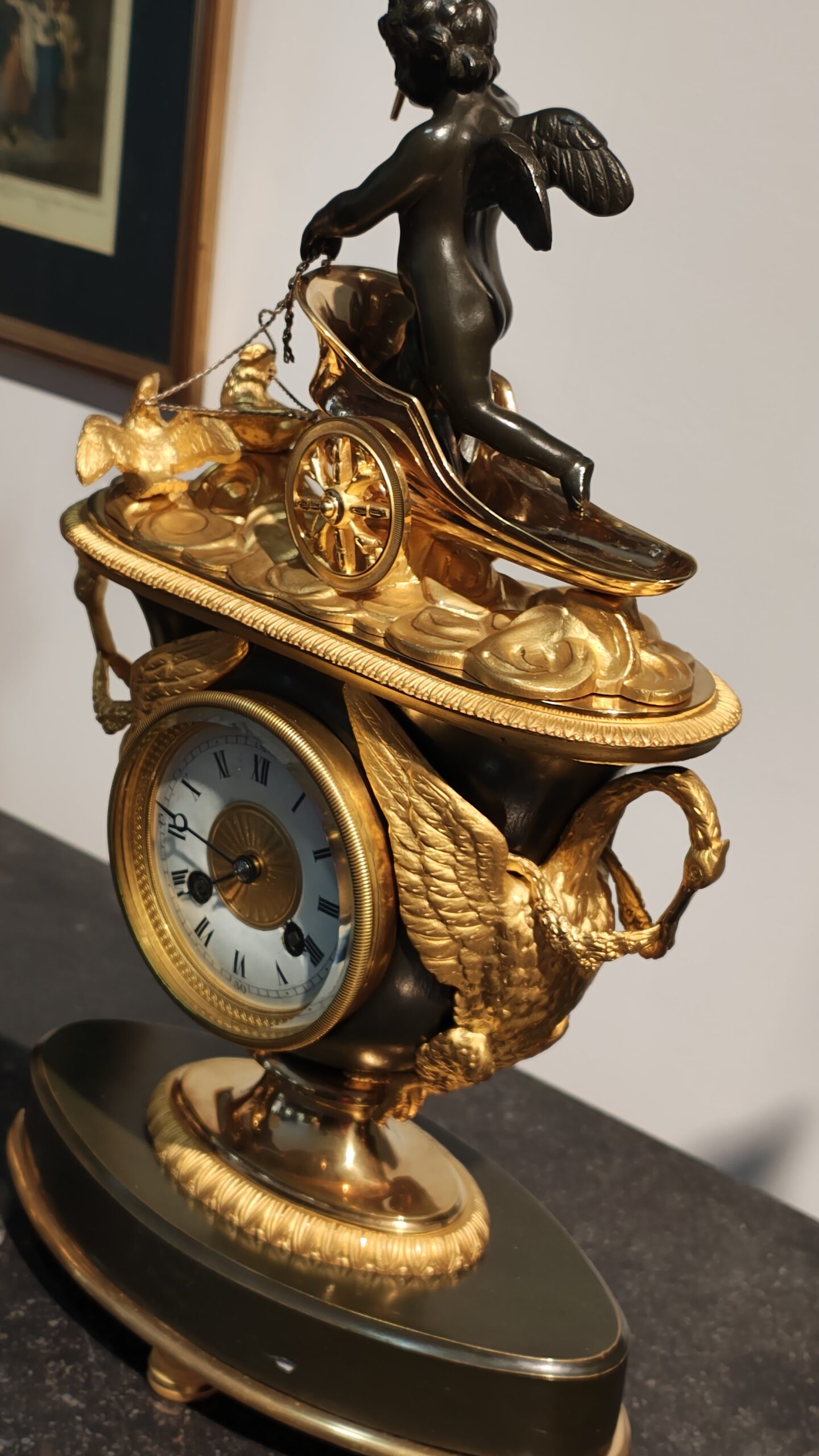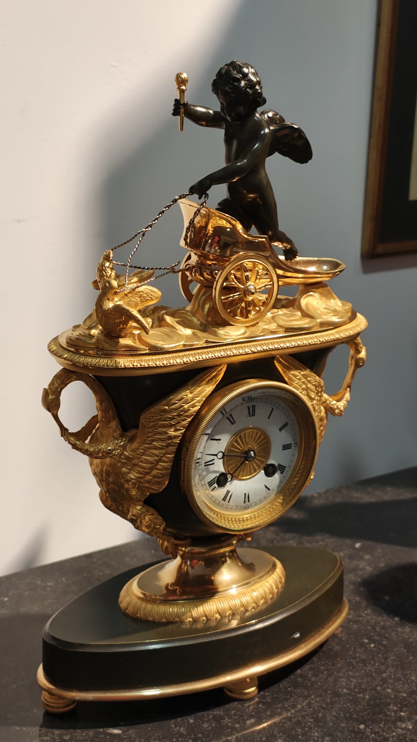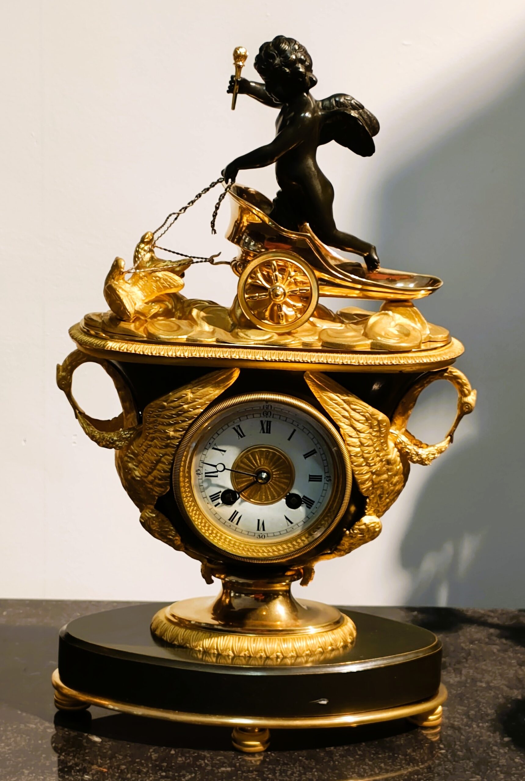 Ten zegar mistrzowsko łączy elementy dwóch odrębnych stylów: zegarów rydwanowych i zegarów wazonowych. Na górze Eros, trzymając lejce w dłoni, prowadzi rydwan miłości sunący po chmurach. Poniżej, korpus w kształcie wazonu zdobią uchwyty w kształcie łabędziej szyi, wykonane z gracją i dbałością o detale.