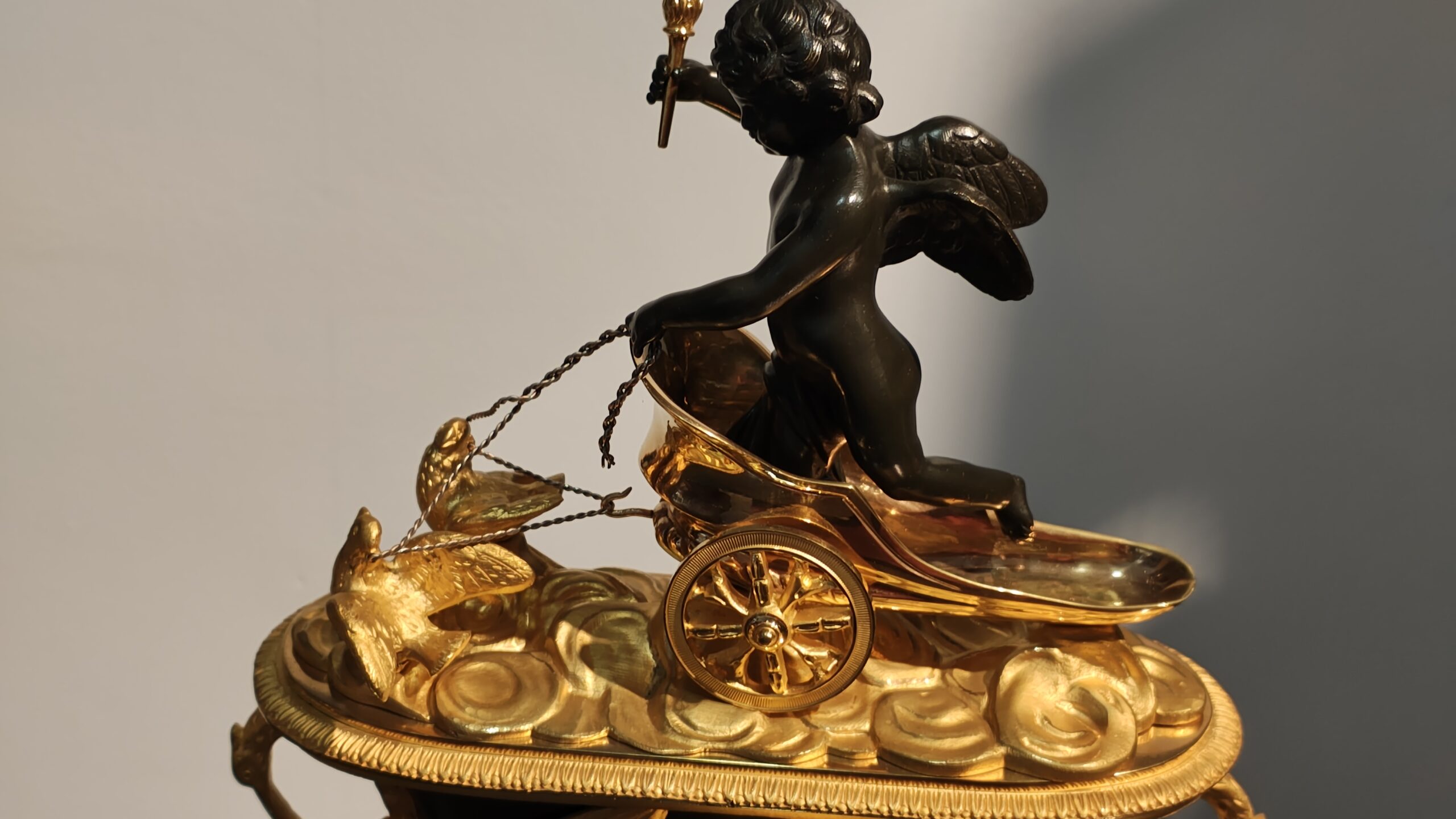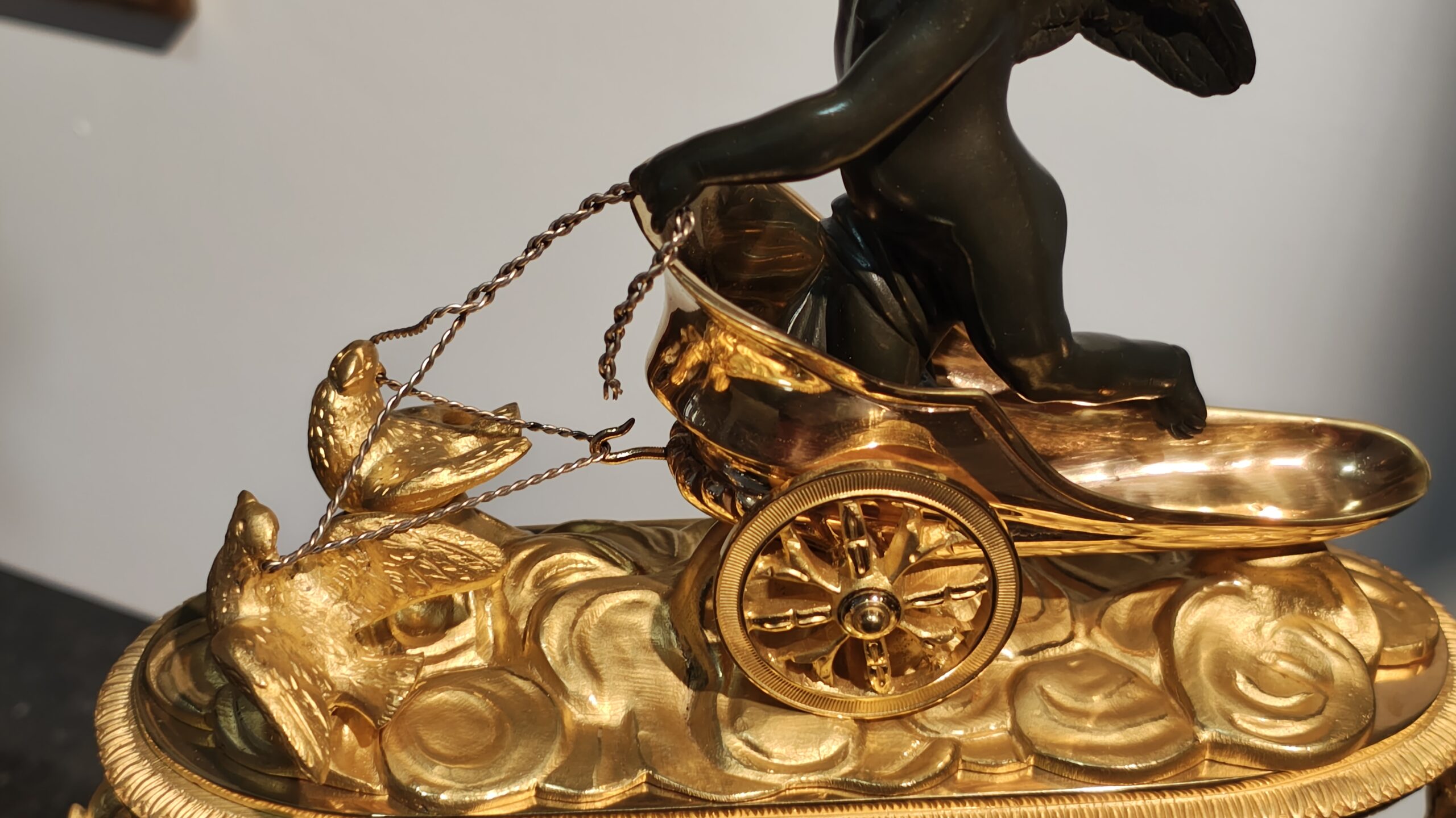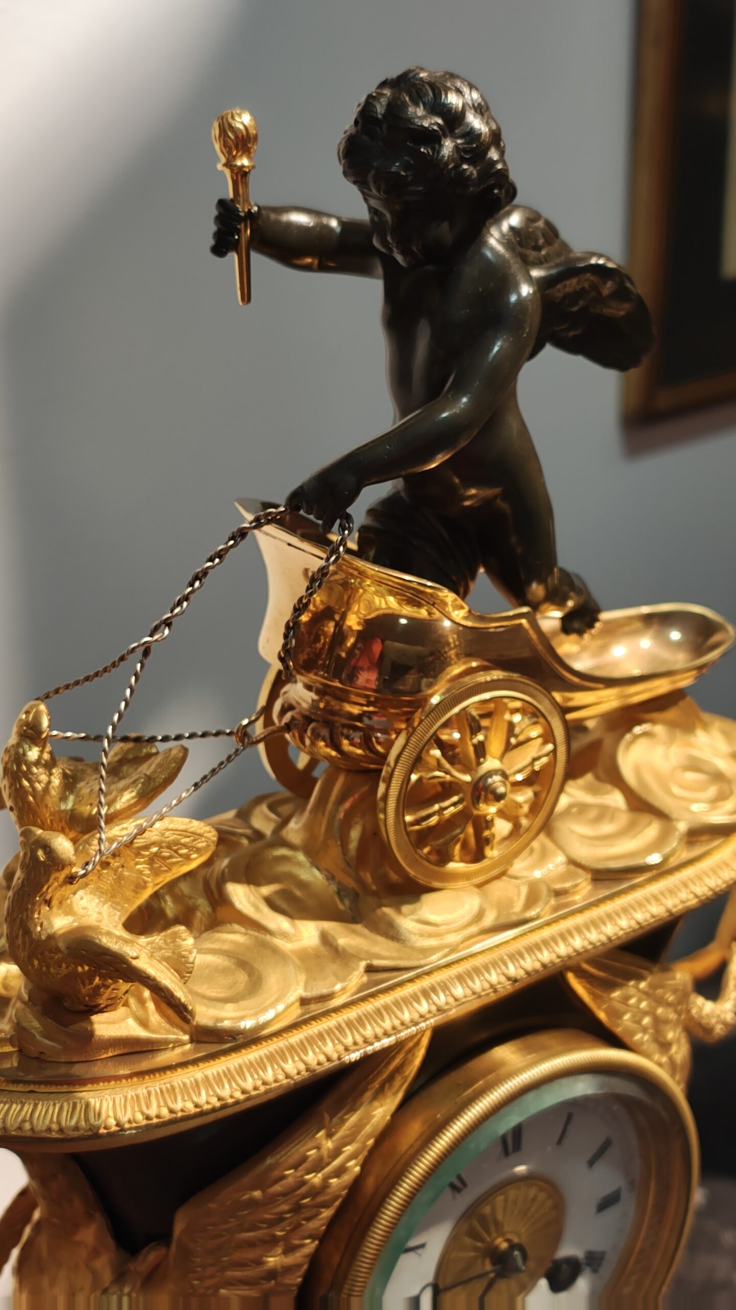 Ten zegar kominkowy Empire z pozłacanego i patynowanego brązu, o jakości muzealnej, wspaniale przedstawia uskrzydlonego Erosa, który prowadzi rydwan ciągnięty przez gołębie po chmurach. W mitologii greckiej gołębie są ściśle związane z Afrodytą, boginią miłości, znaną w mitologii rzymskiej jako Wenus.