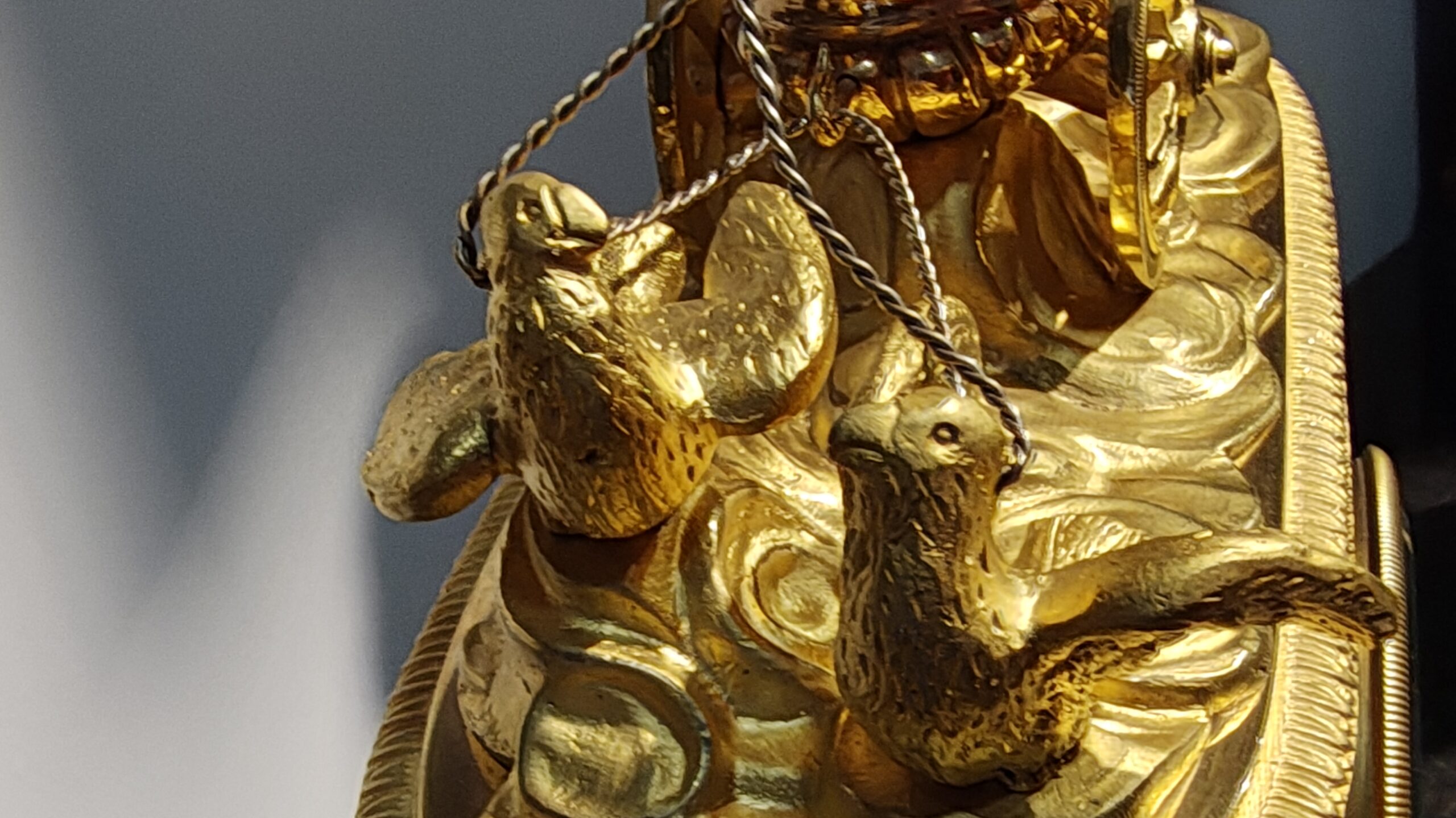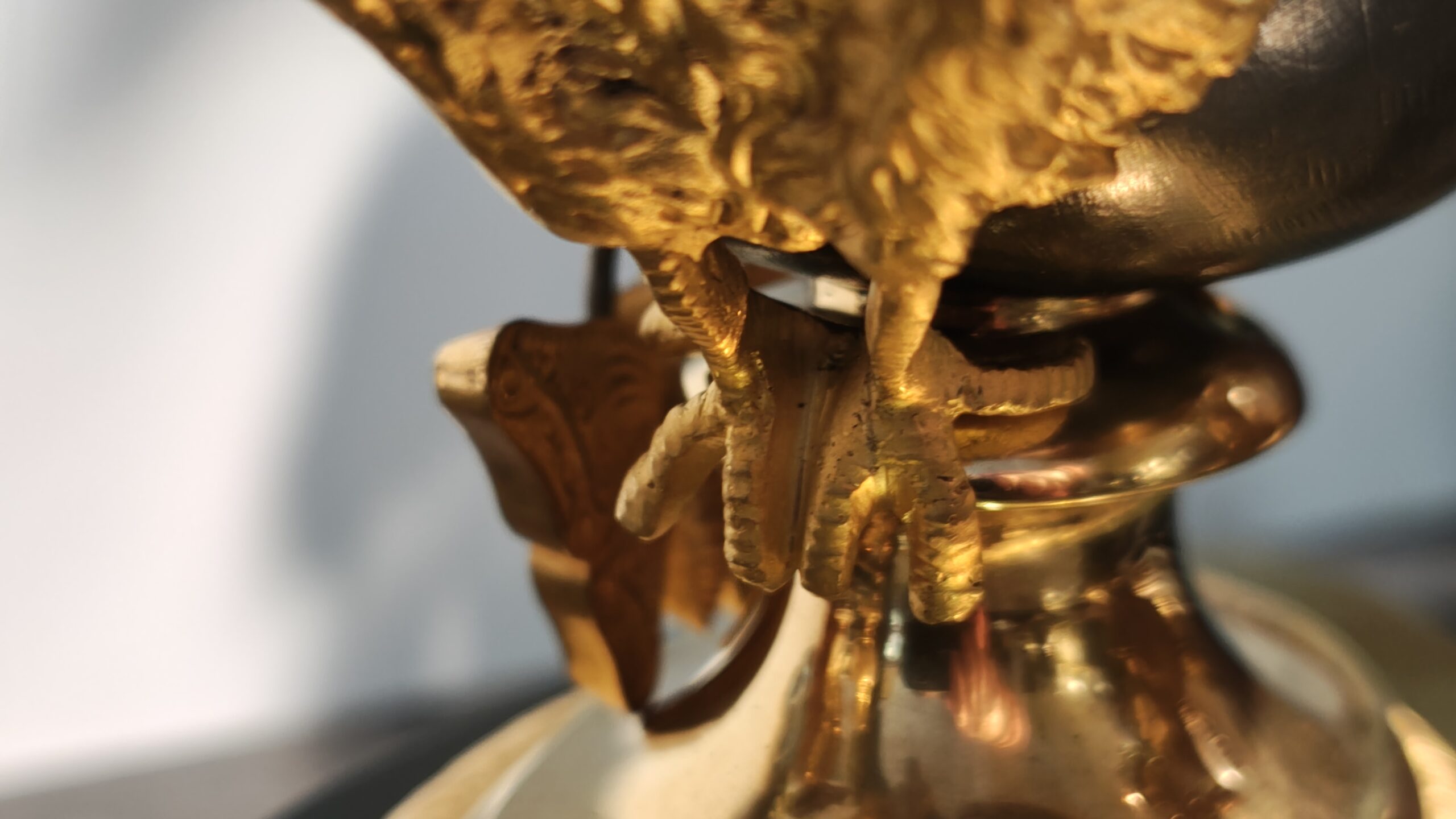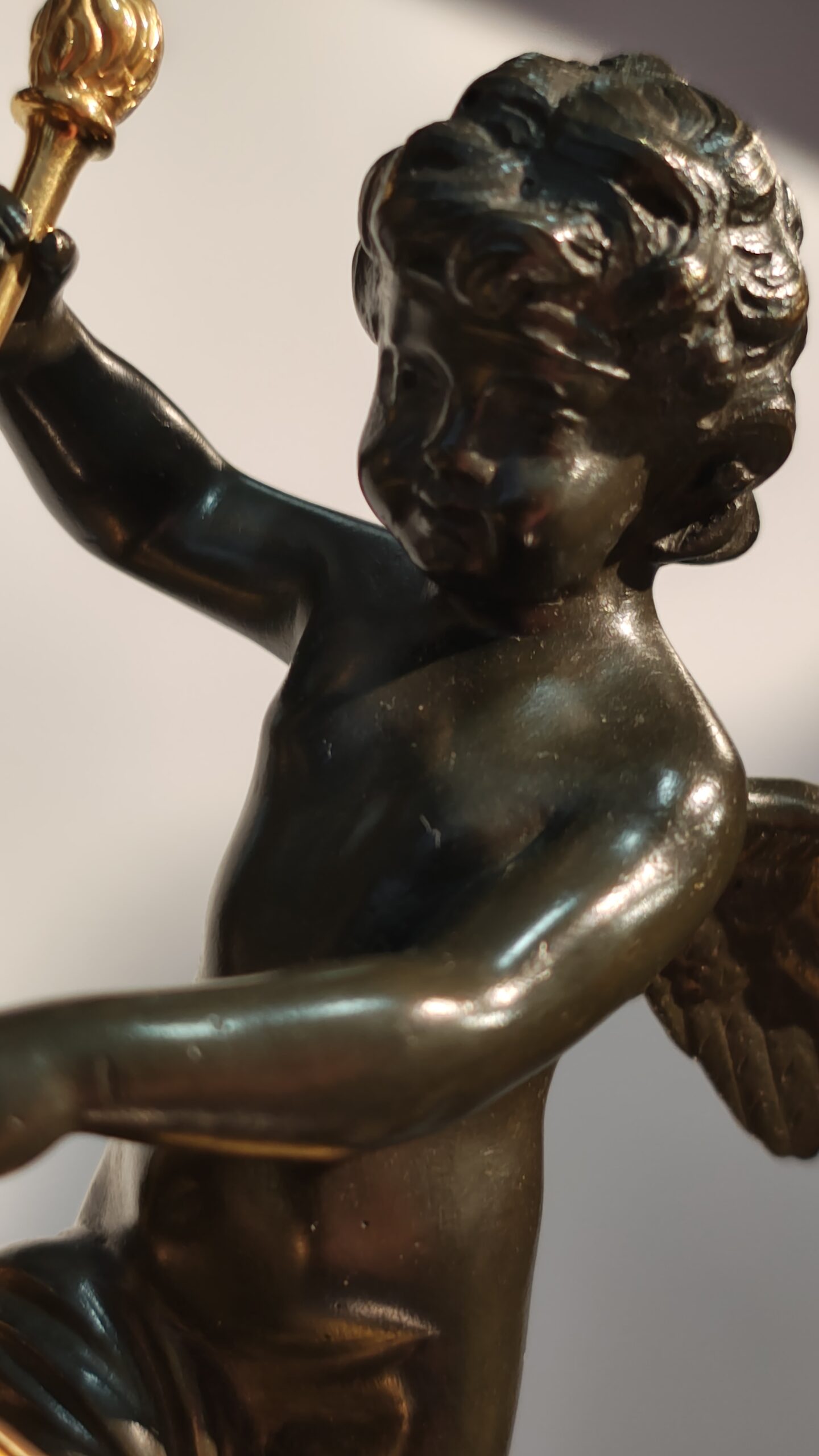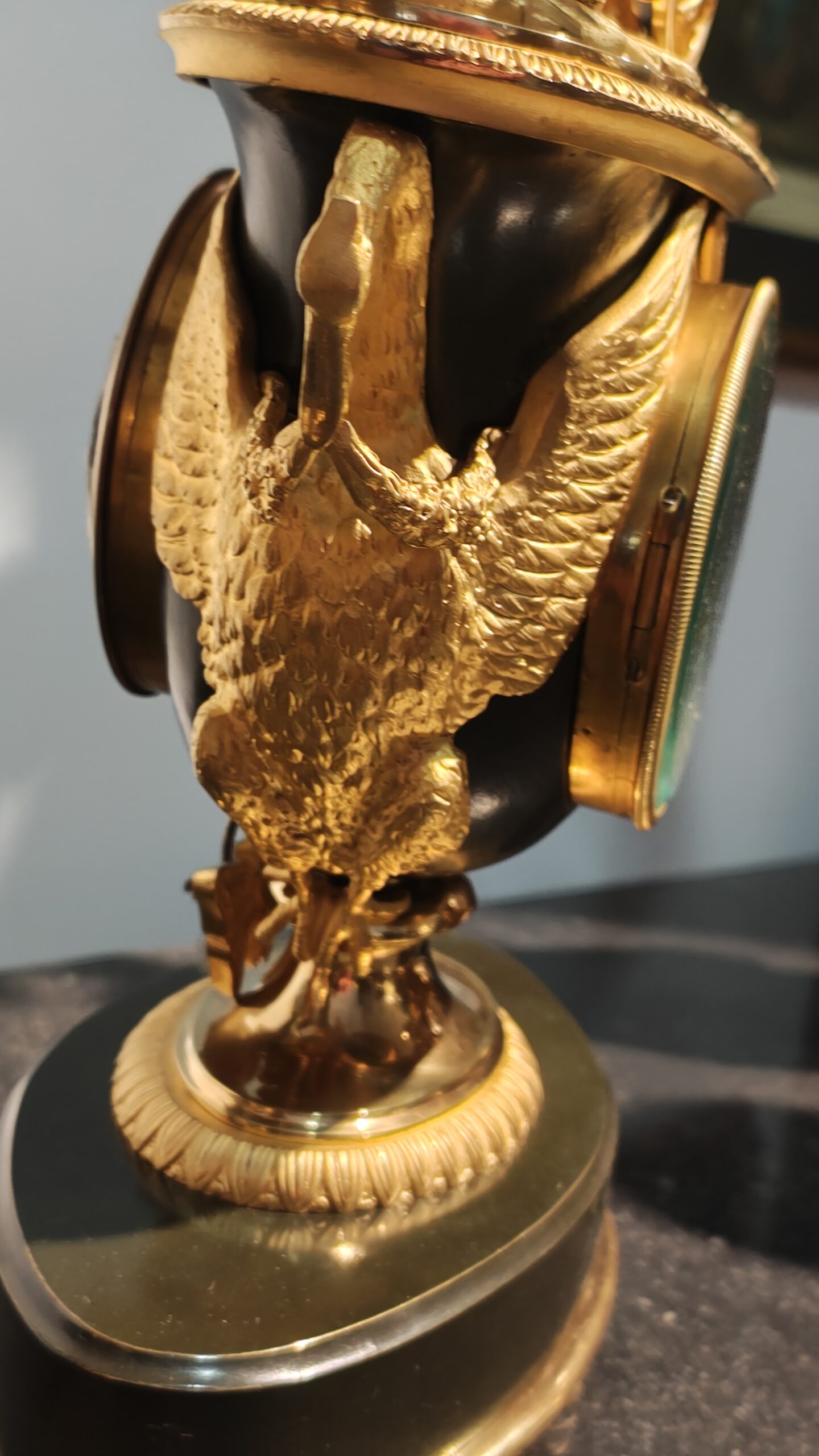 Ten zegar kominkowy Empire z pozłacanego i patynowanego brązu, o jakości muzealnej, wspaniale przedstawia uskrzydlonego Erosa, który prowadzi rydwan ciągnięty przez gołębie po chmurach. W mitologii greckiej gołębie są ściśle związane z Afrodytą, boginią miłości, znaną w mitologii rzymskiej jako Wenus.